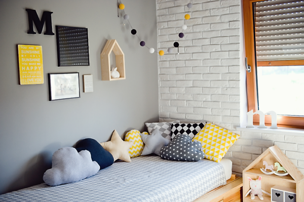 Na takim tle świetnie prezentują się drewniane półki czy dekoracje, a jeśli jeszcze gdzieś w kącie znajdzie się kosz czy worek papierowy, a na ścianie delikatna grafika, pokój dziecka zamieni się w prawdziwą krainę z bajki.
