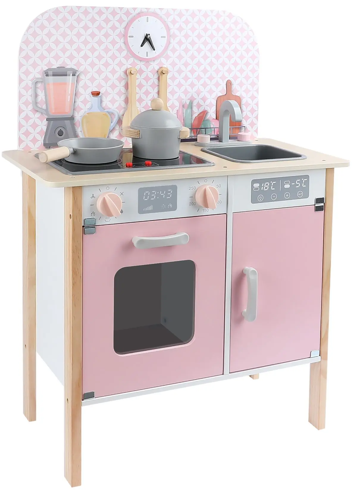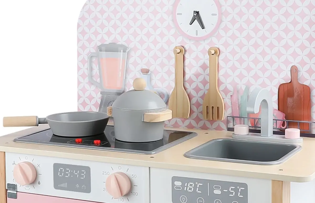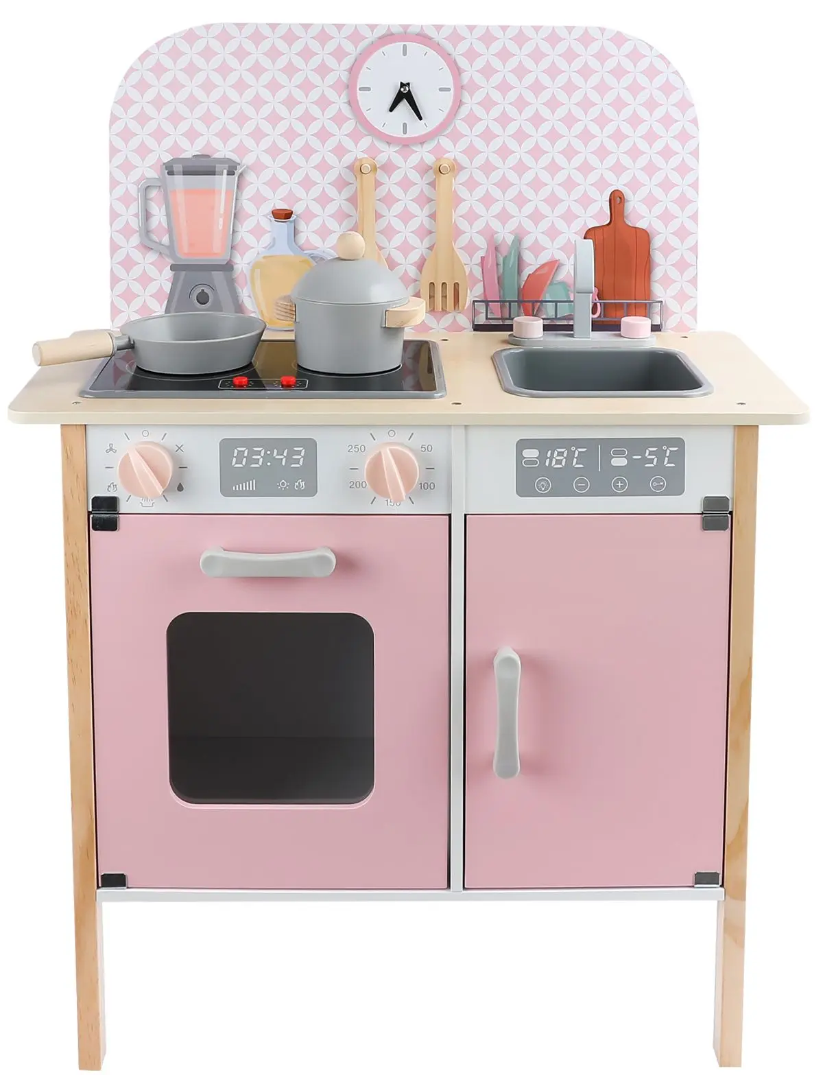 Drewniana kuchnia dla dzieci z zegarem | Różowa
