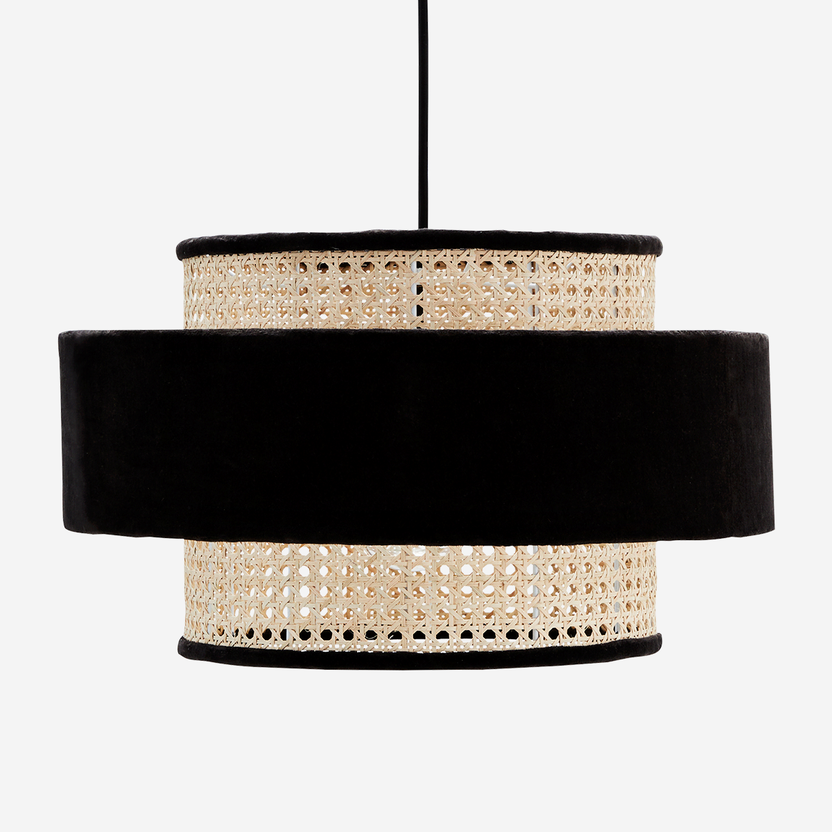 Abażur lampy wykonano z połączenia bambusa i aksamitnej tkaniny. Całość wygląda lekko i zgrabnie – to świetny wybór do zastosowania w salonie, jadalni czy sypialni.