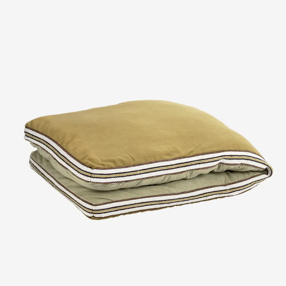 Bawełniany materac w kolorze musztardowym to idealne rozwiązanie dla osób ceniących nieformalny styl i wszechstronność. Jego unikalna, dwustronna konstrukcja pozwala na wybór między energetyczną musztardą a neutralnym piaskiem, co daje swobodę w dopasowaniu do nastroju wnętrza. Wyrazista, pasiasta lamówka na krawędziach stanowi stylowy kontrast, nawiązując do tradycyjnego duńskiego wzornictwa ludowego. Dzięki swojej formie materac świetnie sprawdzi się jako miękkie siedzisko na ławce, podłoże w kąciku do czytania lub komfortowa mata na tarasie czy balkonie.