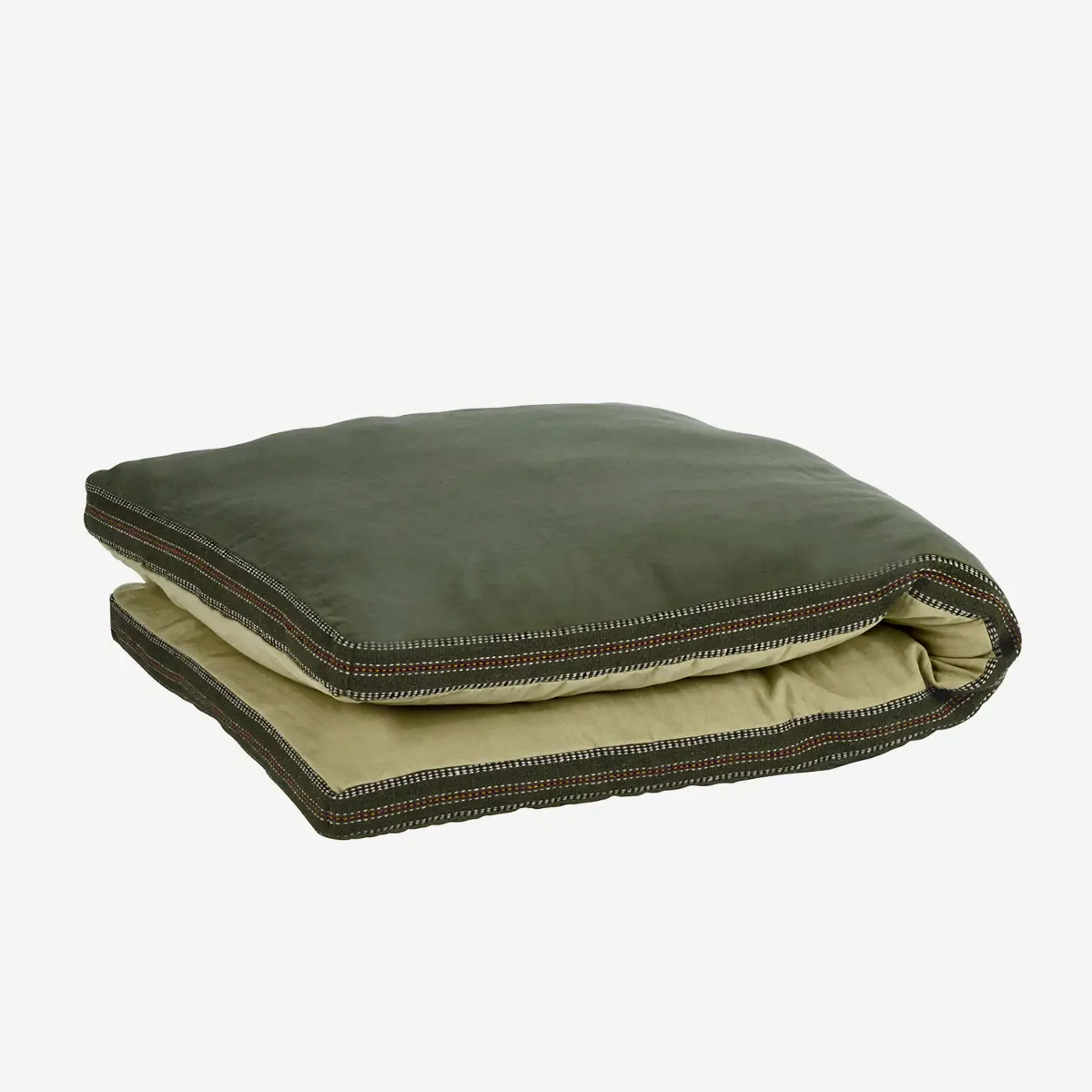 Bawełniany materac w kolorze przykurzonej zieleni to synonim relaksu i funkcjonalności, który odnajdzie się w każdym zakątku domu oraz na tarasie. Wykonany w Indiach, charakteryzuje się unikalną, dwustronną konstrukcją: jedna strona zachwyca głębokim odcieniem przykurzonej zieleni, druga zaś oferuje spokój neutralnego piasku. Całość spaja kontrastowa, pasiasta lamówka, która nawiązuje do klasycznego duńskiego wzornictwa ludowego. Dzięki optymalnym wymiarom materac idealnie pasuje do mebli z kolekcji, ale może być również używany bezpośrednio na podłodze jako wygodne miejsce do czytania, zabawy lub popołudniowej drzemki.