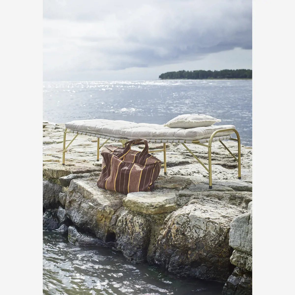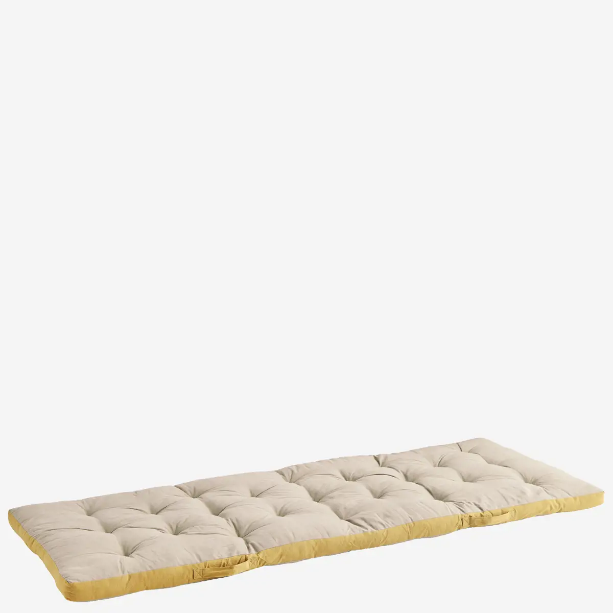 Dwustronny materac w kolorze taupe, z żółtą lamówką. Materiał zewnętrzny wykonany z najwyższej jakości bawełny. Miękkie, bawełniane wypełnienie sprawia, że można na nim spędzać długie letnie wieczory oraz relaksować się na tarasie z ulubioną książką.