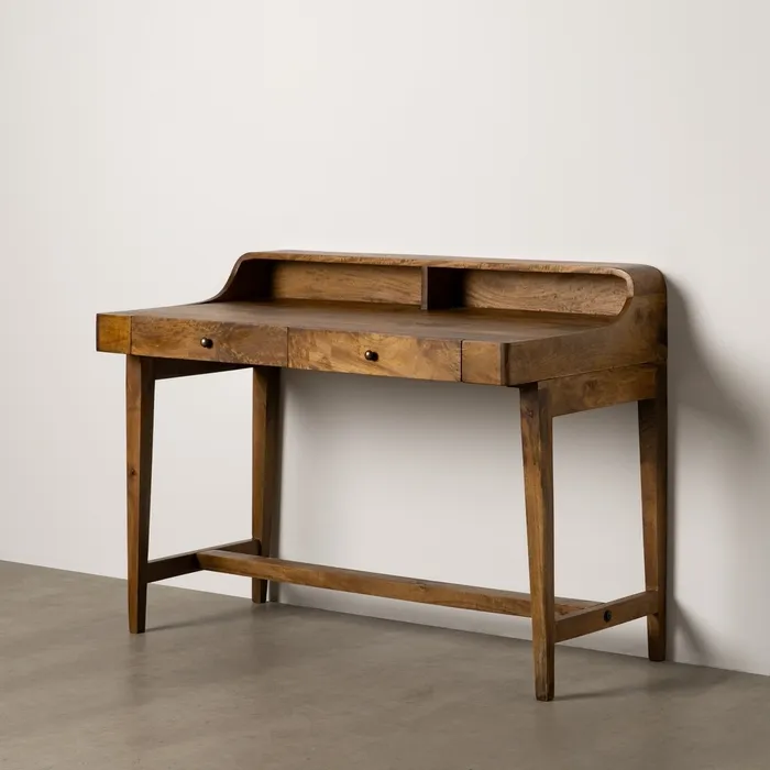 To biurko to ponadczasowy mebel, który czerpie inspirację z klasycznego designu, jednocześnie idealnie wpisując się w nowoczesne wnętrza. Wykonane z drewna mango, o głębokim, naturalnym wykończeniu, łączy w sobie elegancję i funkcjonalność. Mebel posiada dwie szuflady do przechowywania dokumentów i drobiazgów, a także praktyczną, podwyższoną nadstawkę z zakrzywionym brzegiem i dodatkowymi przegródkami. To idealne rozwiązanie dla osób poszukujących harmonii i porządku w swoim miejscu pracy.