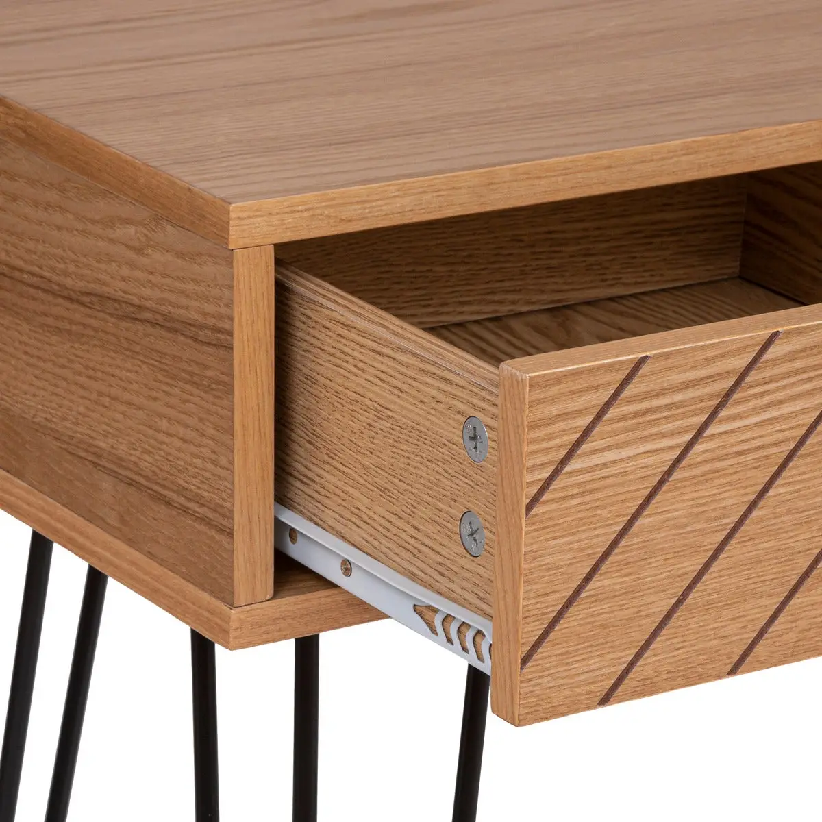 Solidny blat wykonano z płyty pilśniowej pokrytej okleiną jesionową. Graficzne nóżki i uchwyty dwóch szuflad są z żelaza. Miejski styl tego mebla idealnie wpasuje się w stonowany wystrój.