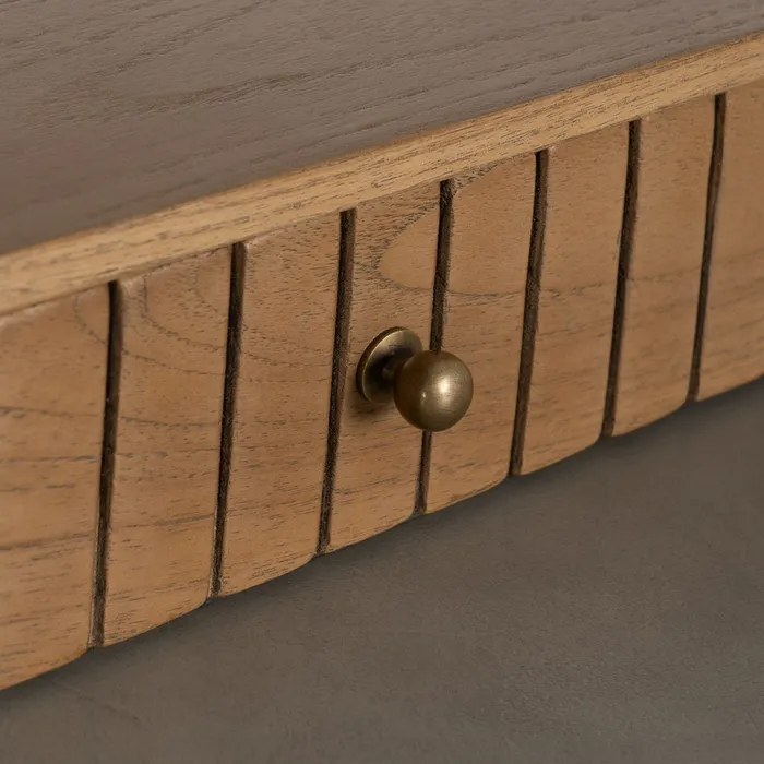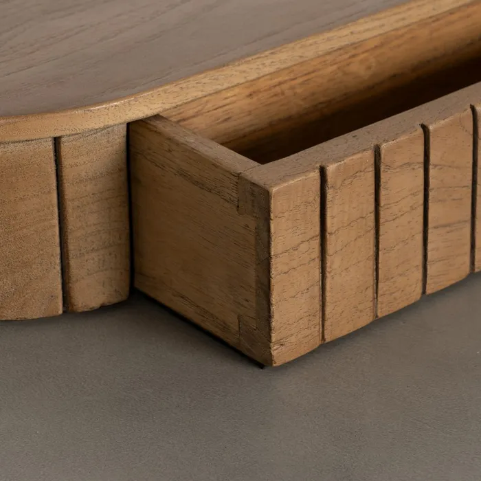 Materiał: Blat wykonany z drewna mindi, znanego z trwałości i estetyki, w połączeniu z mikrobetonem, który nadaje meblowi nowoczesny charakter.
