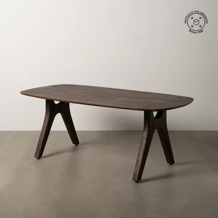 Brązowy stół z drewna mango to elegancki i solidny mebel o wyrazistej, naturalnej estetyce. Owalny blat stołu charakteryzuje się gładką powierzchnią i ciepłą, bogatą barwą brązu, z widocznymi naturalnymi słojami drewna, które podkreślają jego unikatowy charakter. Drewno mango, znane ze swojej trwałości i wytrzymałości, nadaje stołowi wyjątkową stabilność oraz długowieczność, a jego kolor i faktura dodają wnętrzu przytulności i naturalnego uroku.