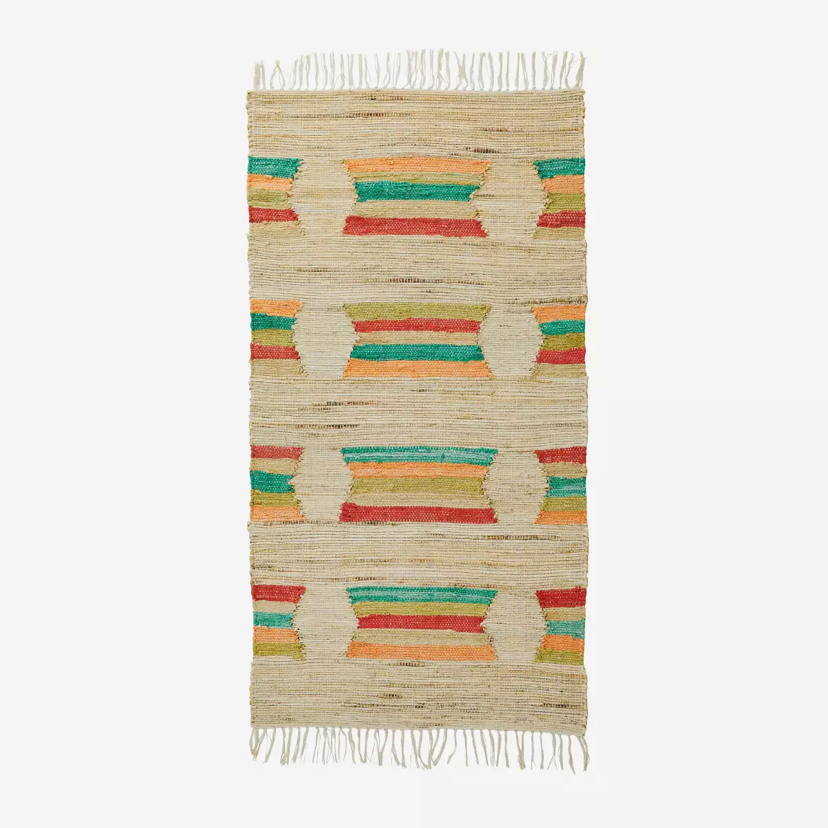 Minimalistyczny chodnik wykonany ręcznie z juty od Madam Stoltz. Naturalny kolor pięknie wpasuje się w proste, naturalne wnętrza a kolorowe wzory nadadzą aranżacji radosnego akcentu. Brzegi zostały wykończone dekoracyjnymi, drobnymi frędzlami które dodają mu swobodnego charakteru.