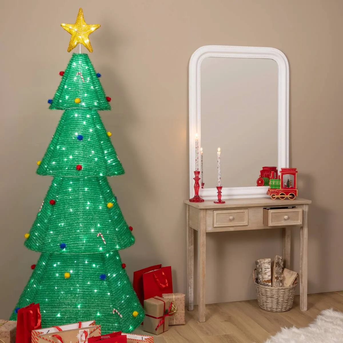 Choinka emituje miękkie, ciepłe światło dzięki zintegrowanej technologii LED, natychmiast budując przytulną atmosferę. Całość wieńczy lśniąca, żółta gwiazda, stanowiąca idealny, świetlisty akcent.