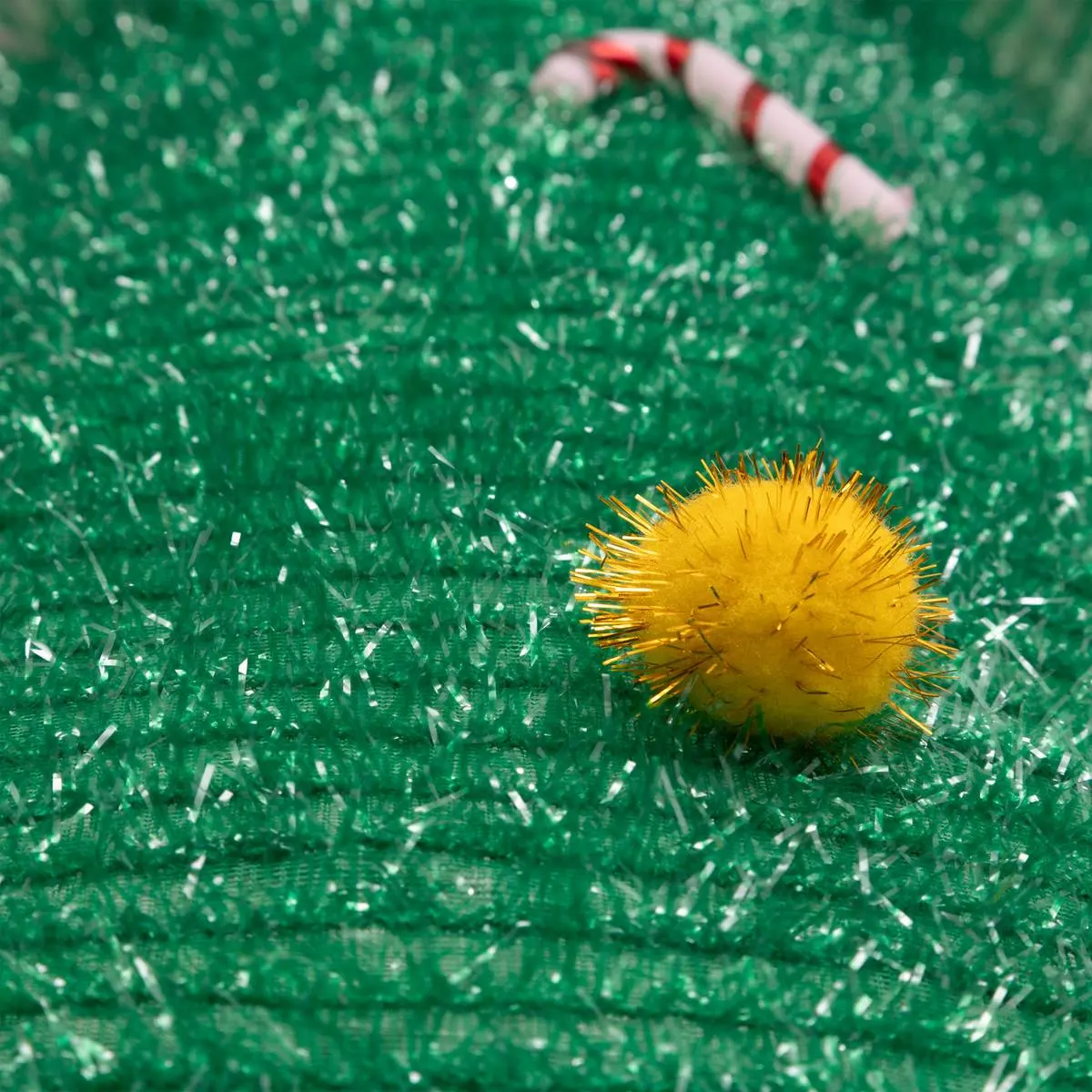 Kolorystyka: Głęboka zieleń z wielokolorowymi pomponami i żółtą gwiazdą.