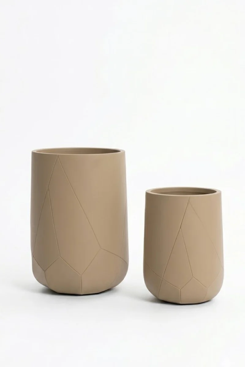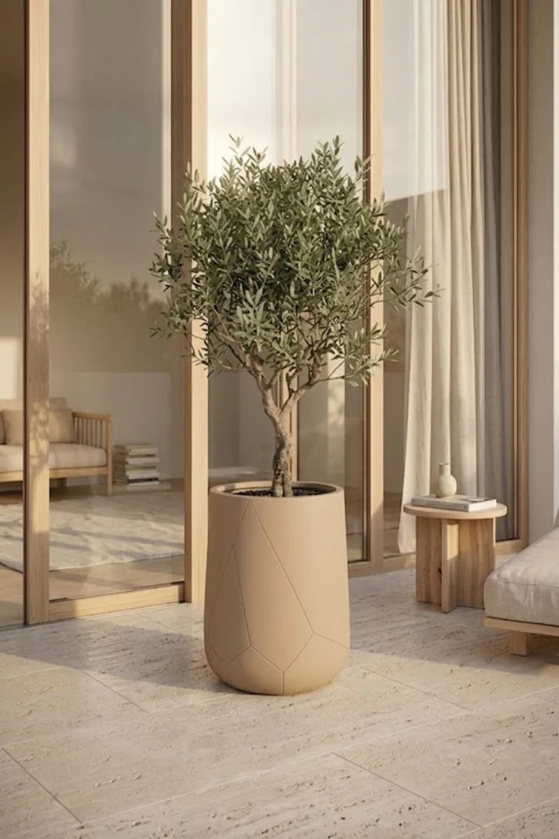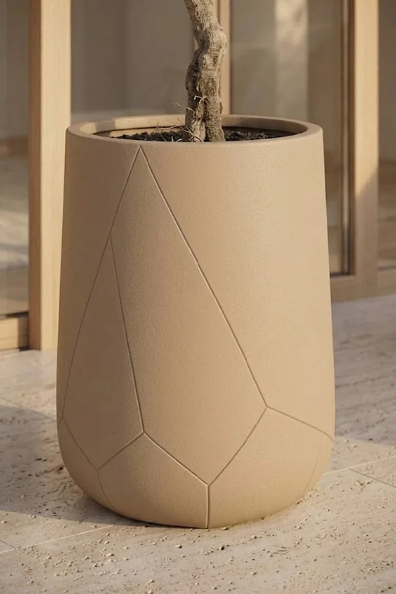 Donica Odelle Beige Tall M (59 cm wysokości) to propozycja dla miejsc, które potrzebują wyrazistych, a zarazem kojących akcentów. Dzięki swoim imponującym proporcjom i szlachetnej, geometrycznej strukturze, model ten przestaje być tylko oprawą dla rośliny, a staje się autonomicznym elementem rzeźbiarskim. Ciepły odcień beżu wprowadza do aranżacji spokój, porządkując nawet najbardziej przestronne wnętrza i tarasy.