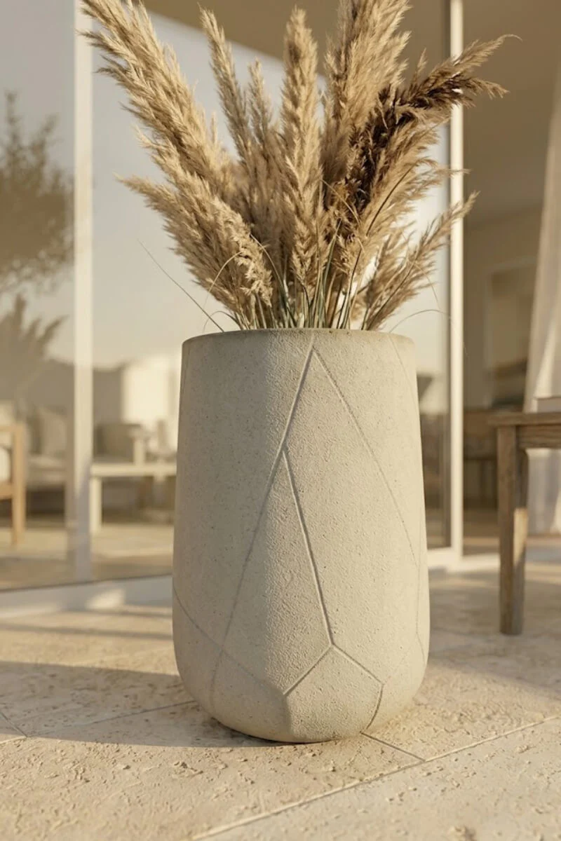 Donica Odelle o wysokości 45 cm to propozycja dla tych, którzy w swojej przestrzeni szukają spokoju i autentyczności. Jej jasna, kamienna kolorystyka w połączeniu z subtelną, geometryczną strukturą tworzy unikalny efekt wizualny – surowy, a zarazem niezwykle przytulny. To idealny fundament dla roślin, który nie dominuje nad ich pięknem, lecz stanowi dla nich szlachetne i nowoczesne tło.