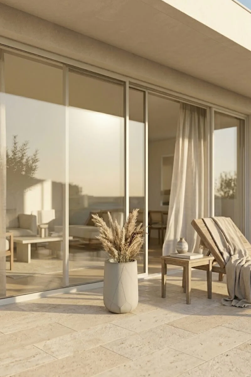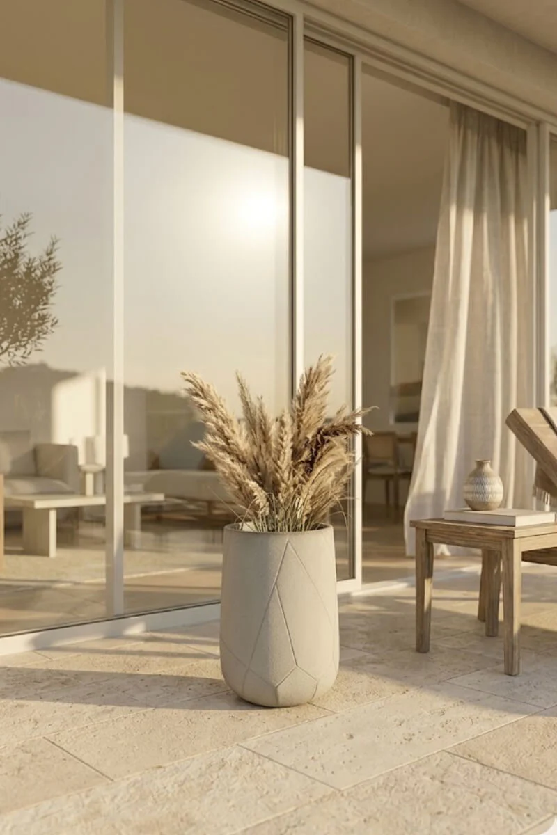 Tarasowa elegancja: Odporność kompozytu sprawia, że donica świetnie odnajduje się na zewnątrz. Jest doskonałą oprawą dla drzewek oliwnych, traw ozdobnych czy lawendy.