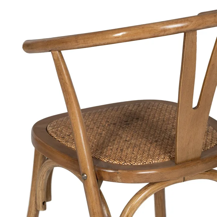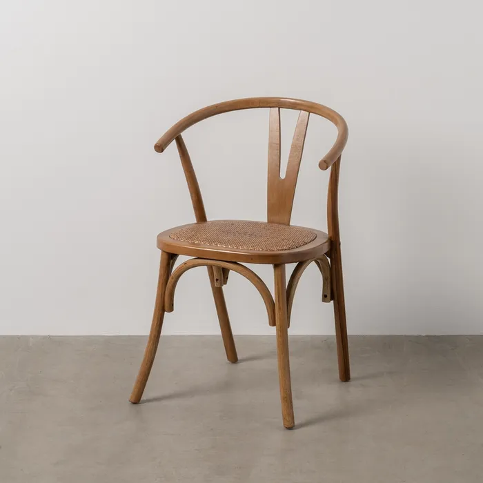 Drewniane krzesło z osobnym oparciem oraz siedziskiem z naturalnego rattanu. Krzesło jest nie tylko funkcjonalnym meblem, ale również elementem ozdobnym wnętrza.