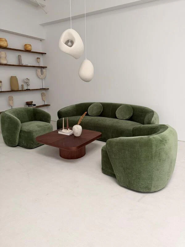 Tapicerka w głębokim, szlachetnym odcieniu zieleni jest kluczowym elementem – ten kolor natychmiast nadaje wnętrzu charakteru, stając się wyrazistym, ale i eleganckim akcentem dekoracyjnym.