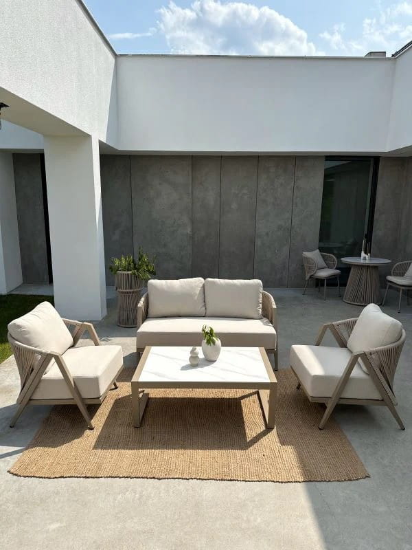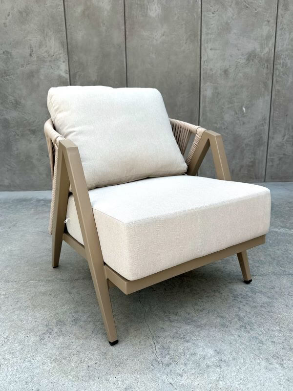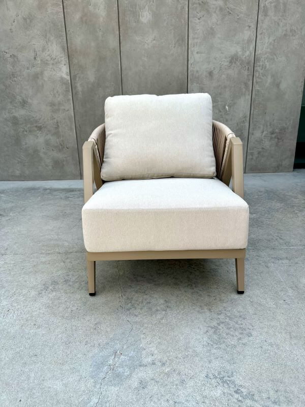 Grube poduszki na siedzisku i oparciu zostały uszyte z tkaniny olefinowej – wyjątkowo wytrzymałej, odpornej na wilgoć, promienie UV oraz zabrudzenia. To komfort, który nie wymaga kompromisów.
