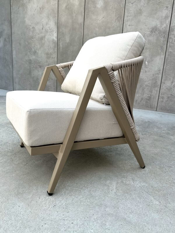 Rama fotela wykonana jest z aluminium malowanego proszkowo – materiału odpornego na korozję i zmienne warunki pogodowe, a przy tym lekkiego, co ułatwia dowolne przestawianie mebla. Idealny zarówno na zewnątrz, jak i do salonu w nowoczesnym duchu.