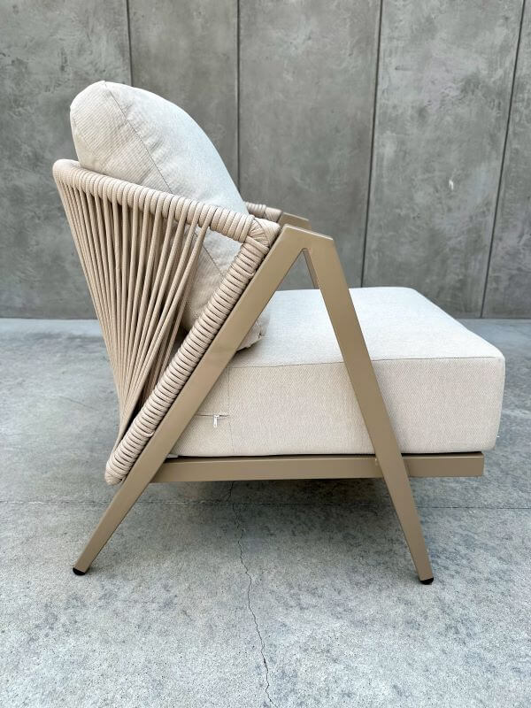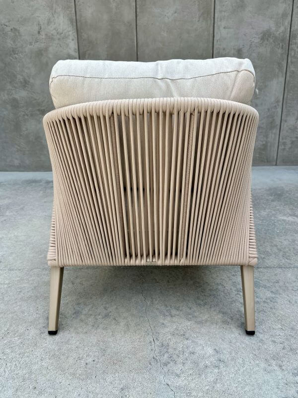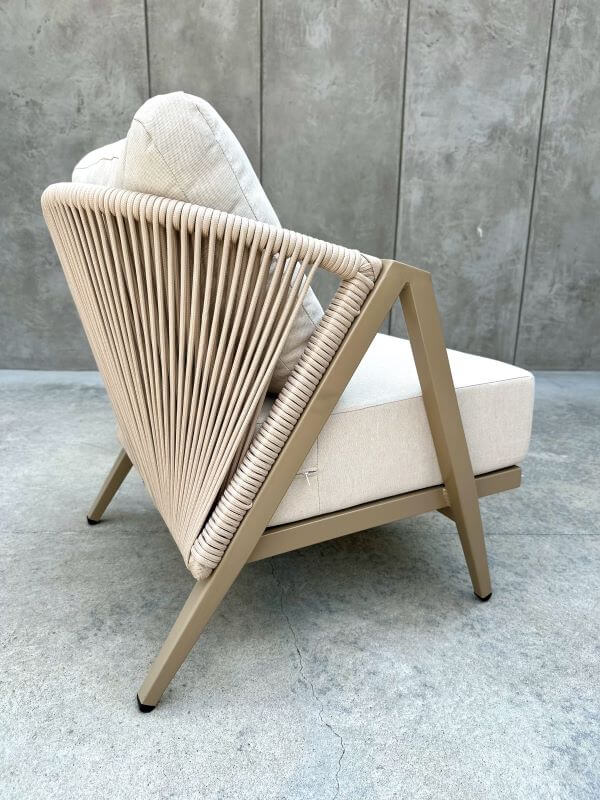 Dekoracyjna plecionka ze sznurka, oplatająca oparcie, nadaje fotelowi unikalnego, lekko artystycznego wyrazu. To detal, który podkreśla jego nowoczesny styl i sprawia, że mebel prezentuje się lekko, ale wyraziście.