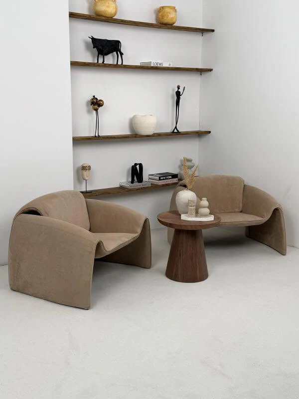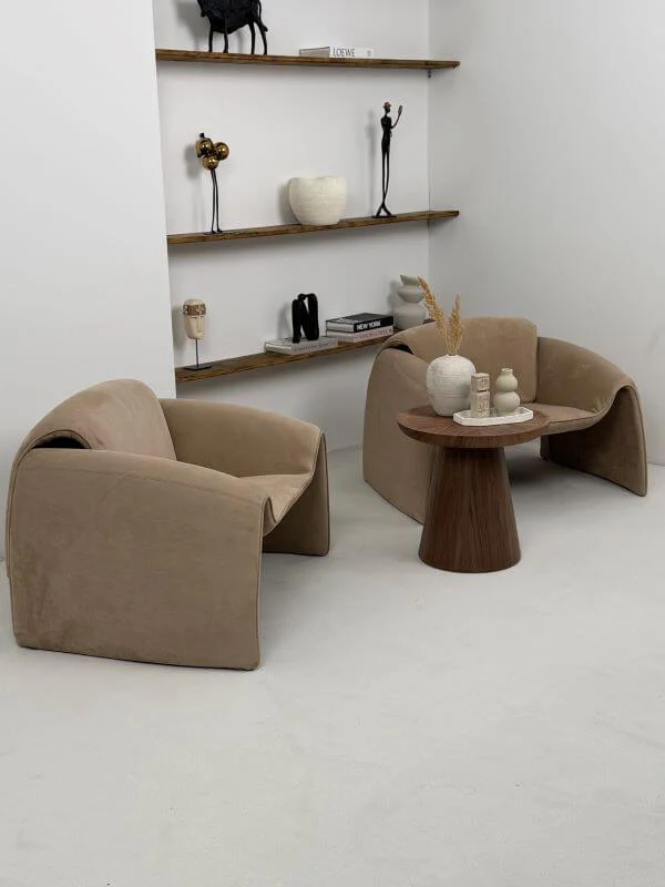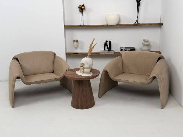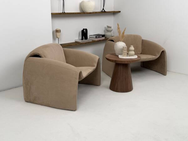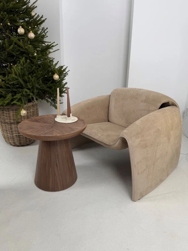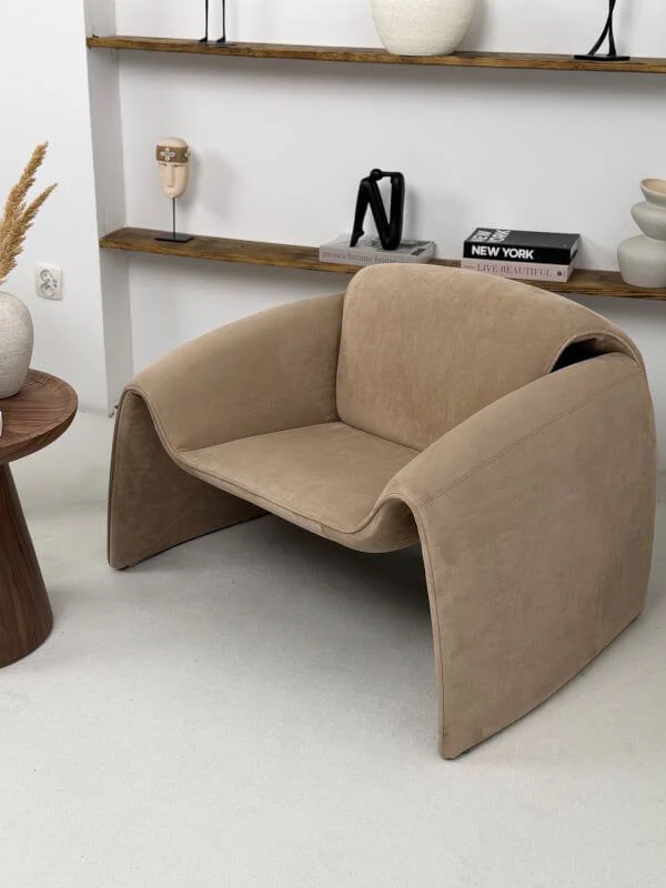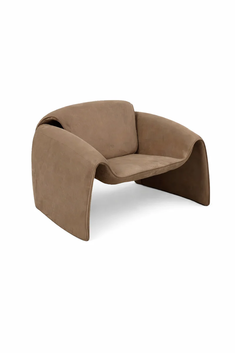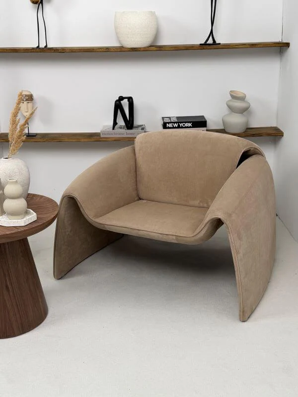 Fotel Raphael - Karmelowy to kwintesencja nowoczesnego designu typu bold – jego obła, niemal rzeźbiarska forma zaprasza do głębokiego relaksu, a głęboki, karmelowy odcień natychmiast ociepla wnętrze, nadając mu prestiżowego charakteru.