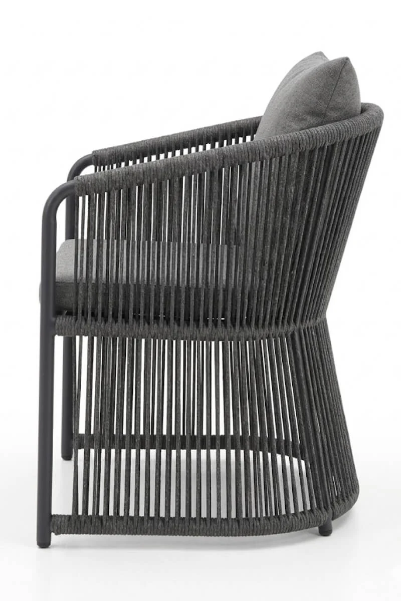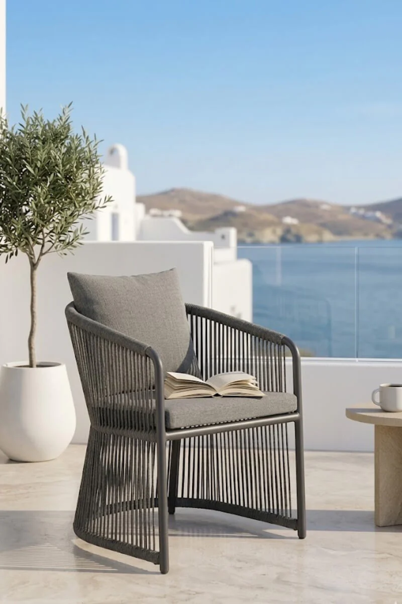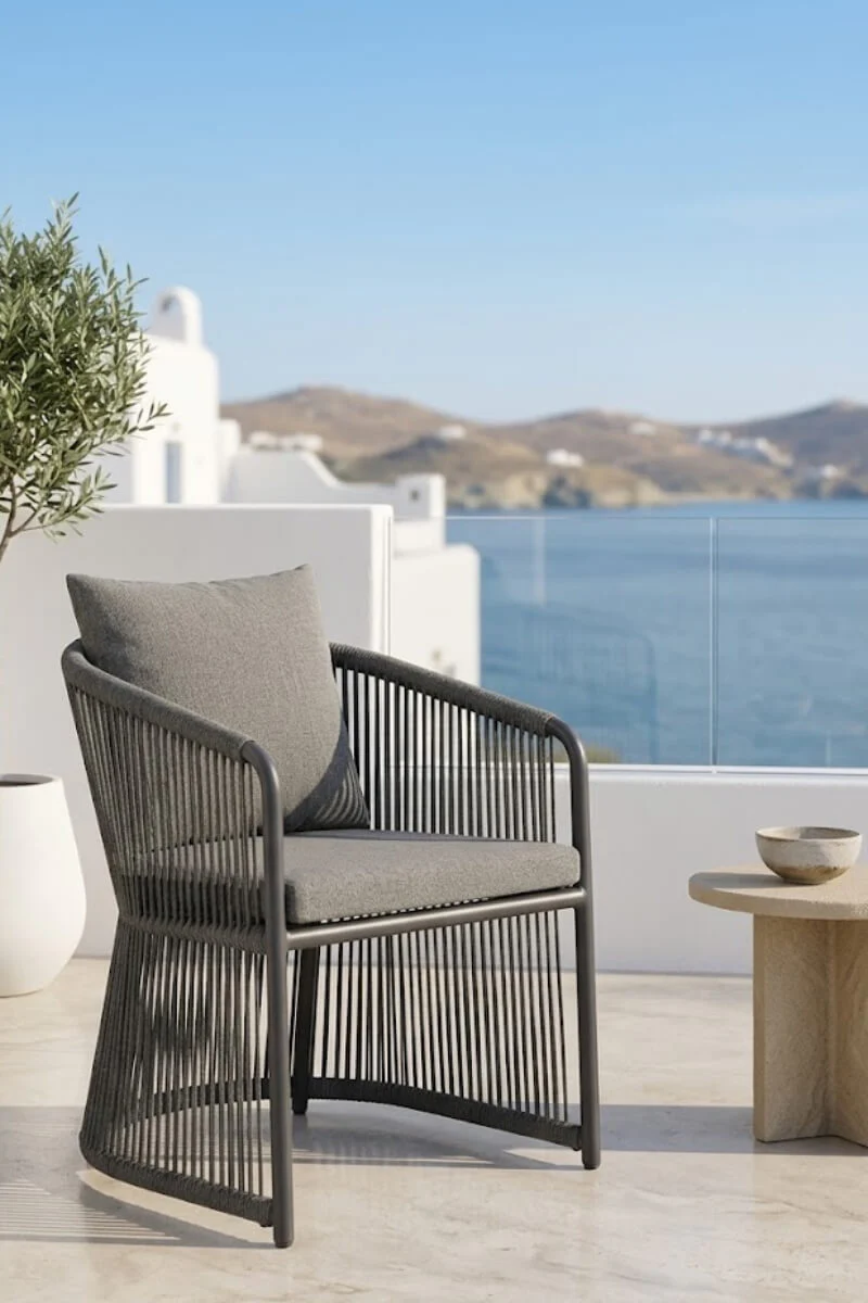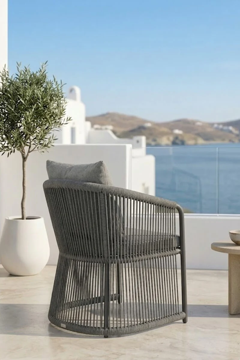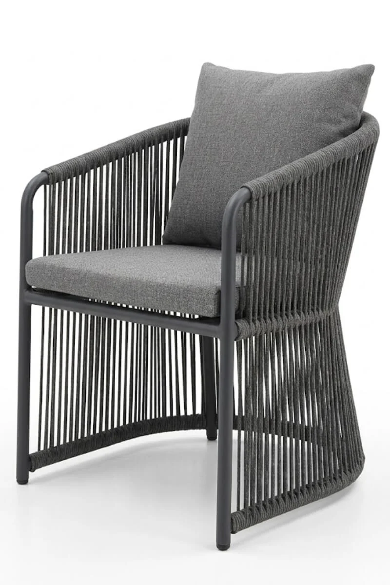 Szary fotel aluminiowy to propozycja dla tych, którzy w projektowaniu przestrzeni unikają przypadkowości. Głęboki, matowy odcień szarości oraz pionowa plecionka tworzą spójną, niemal rzeźbiarską bryłę, która narzuca tarasowi nowoczesny, uporządkowany rytm. To mebel, który nie prosi o uwagę – on ją naturalnie przyciąga swoją konsekwentną formą i surową elegancją.