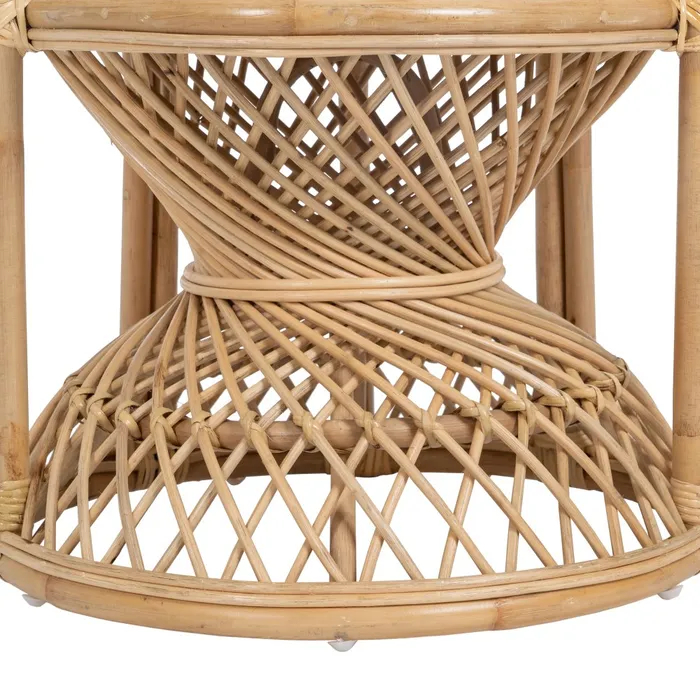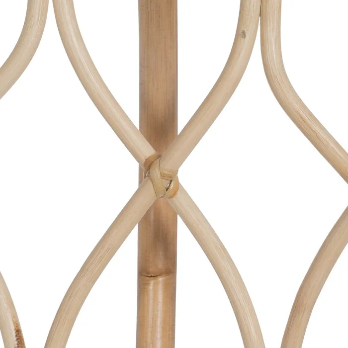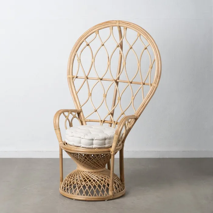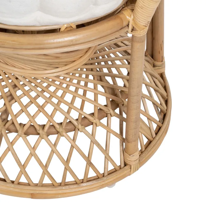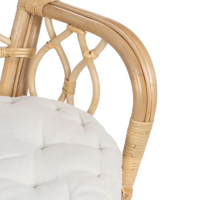 Fotel wyposażony jest w miękką, pikowaną poduszkę w jasnym kolorze, która zapewnia wyjątkowy komfort podczas siedzenia. Poduszka, dzięki swojej miękkości i eleganckiemu pikowaniu, doskonale komponuje się z naturalnym rattanu, a jednocześnie gwarantuje wygodę i odprężenie. Jej jasny kolor wprowadza do przestrzeni świeżość i lekkość, idealnie pasując do stylów takich jak boho, skandynawski czy nowoczesny.