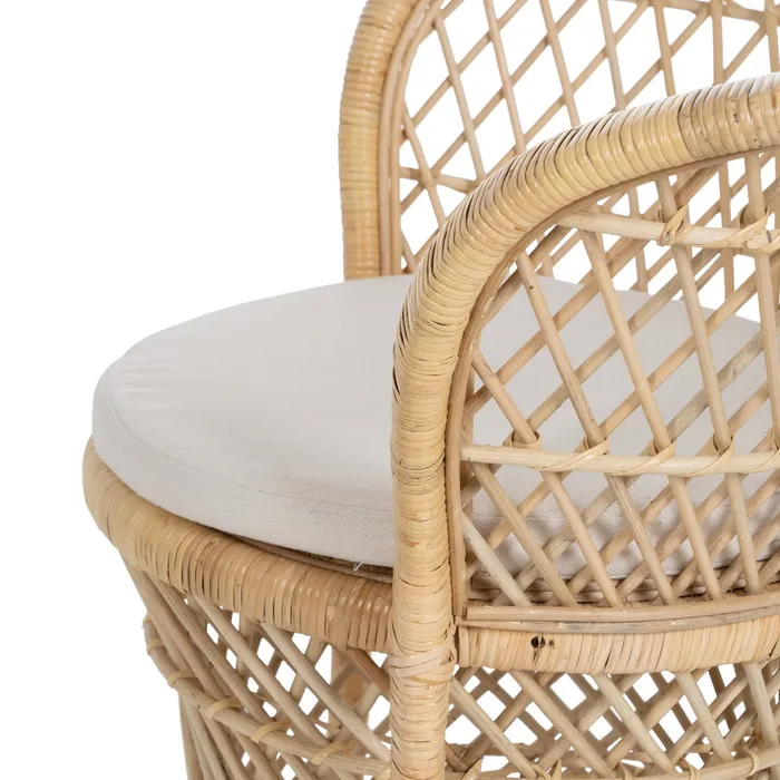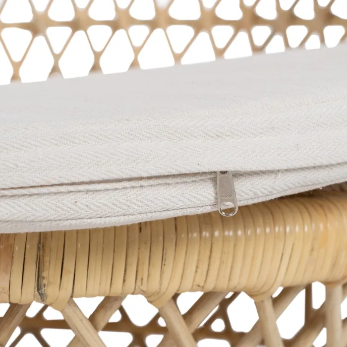 Fotel wyposażony jest w jasną, zdejmowaną poduszkę, która podnosi komfort siedzenia. Poduszka wykonana z miękkiego materiału stanowi kontrast do twardego rattanu, oferując dodatkową wygodę i umożliwiając łatwe czyszczenie dzięki możliwości jej zdjęcia. Jasny kolor poduszki współgra z naturalnym odcieniem rattanu, wprowadzając do wnętrza przytulność i świeżość.
