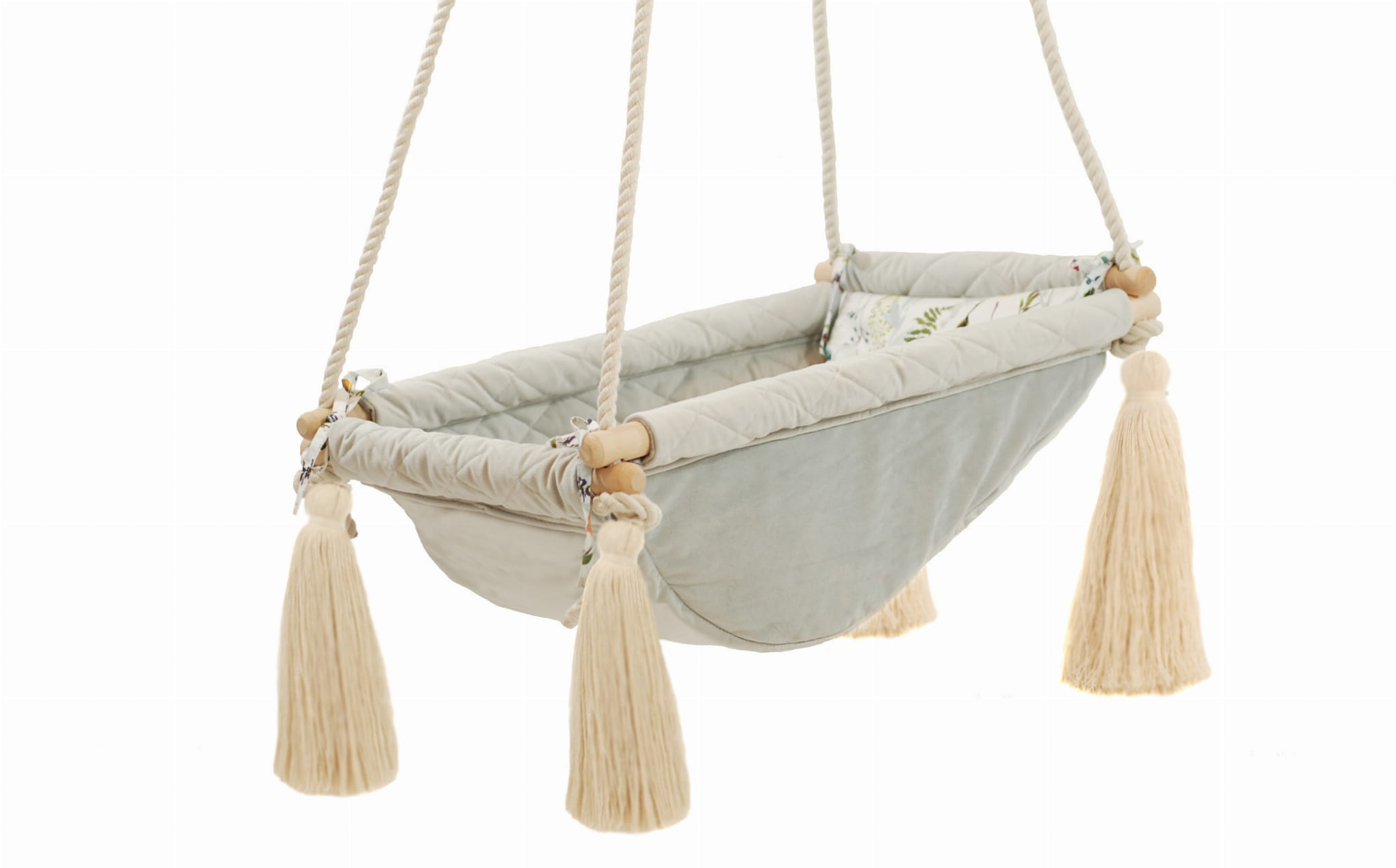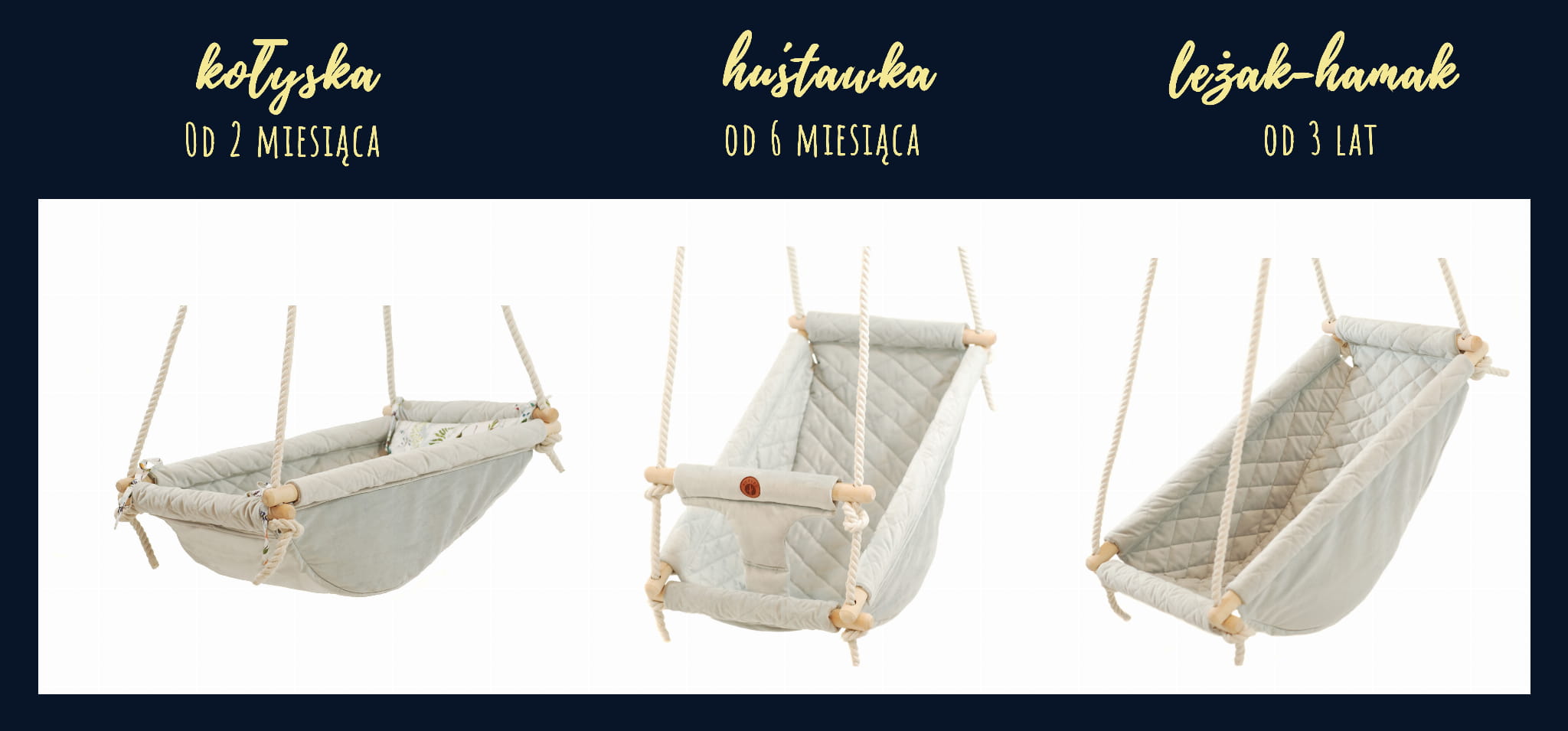 Kołysko-huśtawka QALAMA w wersji podstawowej, nie posiada w zestawie dodatkowych akcesoriów. Można je dołączyć przy składaniu zamówienia wybierając odpowiednie opcje.