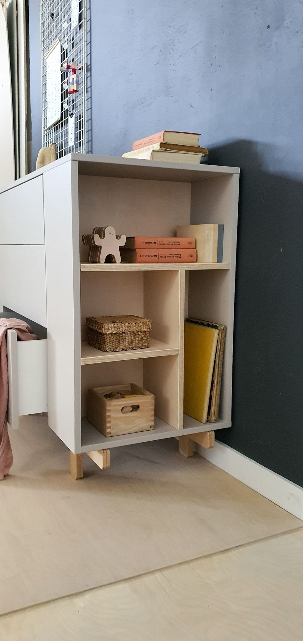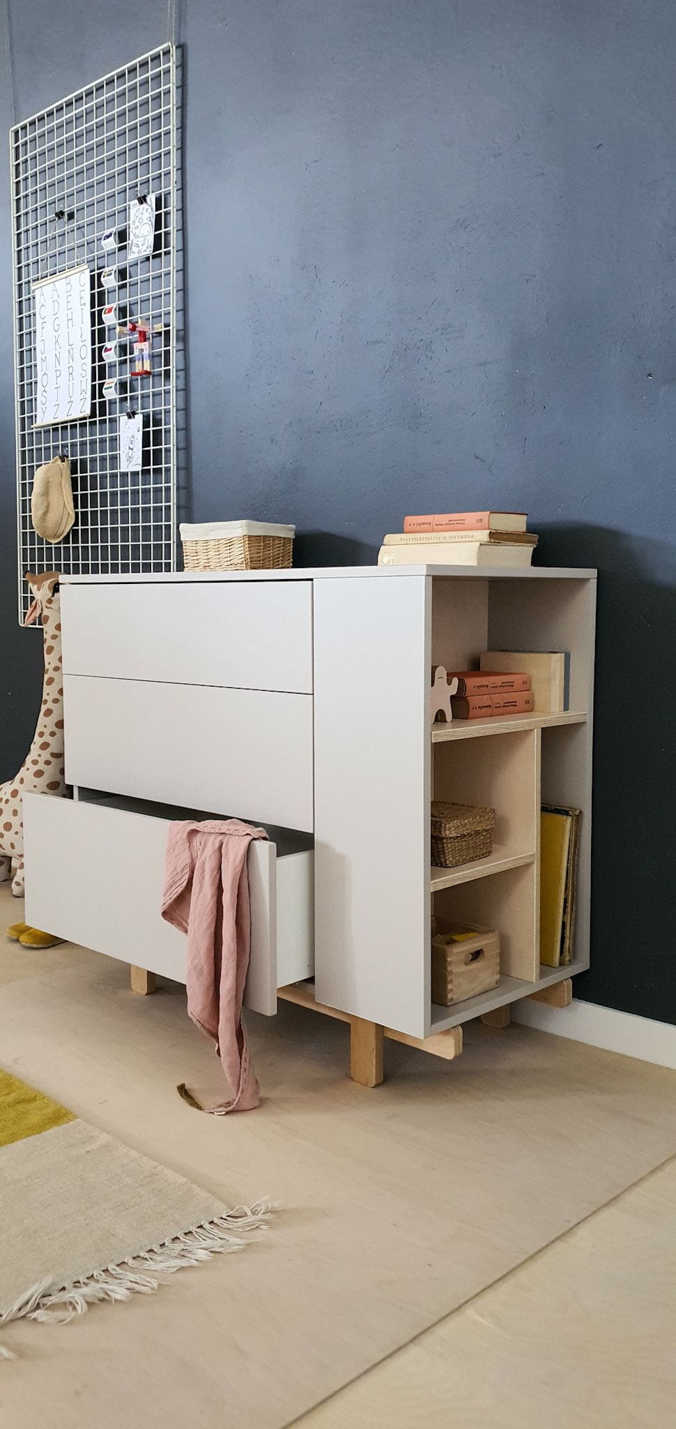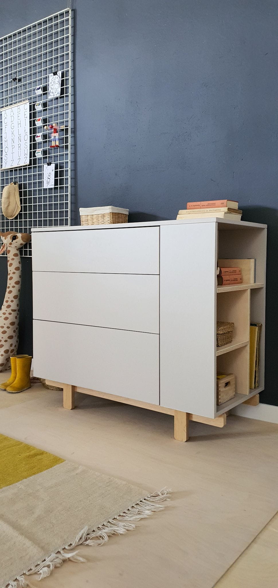 Piękna, klasyczna komoda w kolorze kaszmiru z dodatkiem naturalnego drewna. Dzięki trzem pojemnym szufladom zapewnia ona wiele miejsca do przechowywania. Szuflady wyposażone są w wysokiej jakości prowadnice z systemem push-to-open, dzięki którym za pomocą kliknięcia można otworzyć każdą z nich. W boku komody znajduje się regał będący nie tylko dodatkowym miejscem do przechowywania ale też elementem dekoracyjnym. Regał może być montowany zarówno po prawej jaki i lewej stronie komody.
