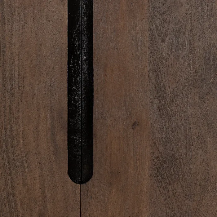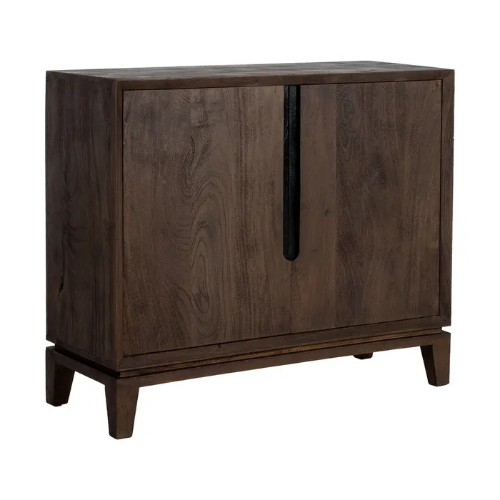 Mebel ten jest idealnym połączeniem funkcjonalności i minimalistycznego designu. Wykonana z ciemnobrązowego drewna mango, emanuje naturalnym ciepłem i solidnością. Mebel o prostej, prostokątnej formie wyróżnia się dwoma drzwiczkami, w których subtelnie wyprofilowane wgłębienia pełnią rolę uchwytów, eliminując potrzebę stosowania dodatkowych okuć. Całość spoczywa na delikatnie zwężanych ku dołowi nóżkach, które dodają konstrukcji lekkości i elegancji.