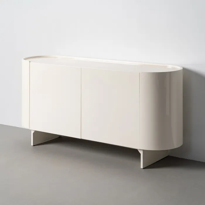 Elegancja spotyka się z funkcjonalnością w formie komody lakierowanej w kremowym kolorze, która stanowi wyrafinowany element wyposażenia nowoczesnej jadalni lub salonu. Wykonana z wysokiej jakości lakierowanej płyty MDF w delikatnym, kremowym odcieniu, została zwieńczona blatem z autentycznego marmuru. To połączenie materiałów sprawia, że mebel emanuje luksusem, a jednocześnie pozostaje niezwykle uniwersalny, wpisując się zarówno w estetykę klasyczną, jak i minimalistyczne trendy modern glam.