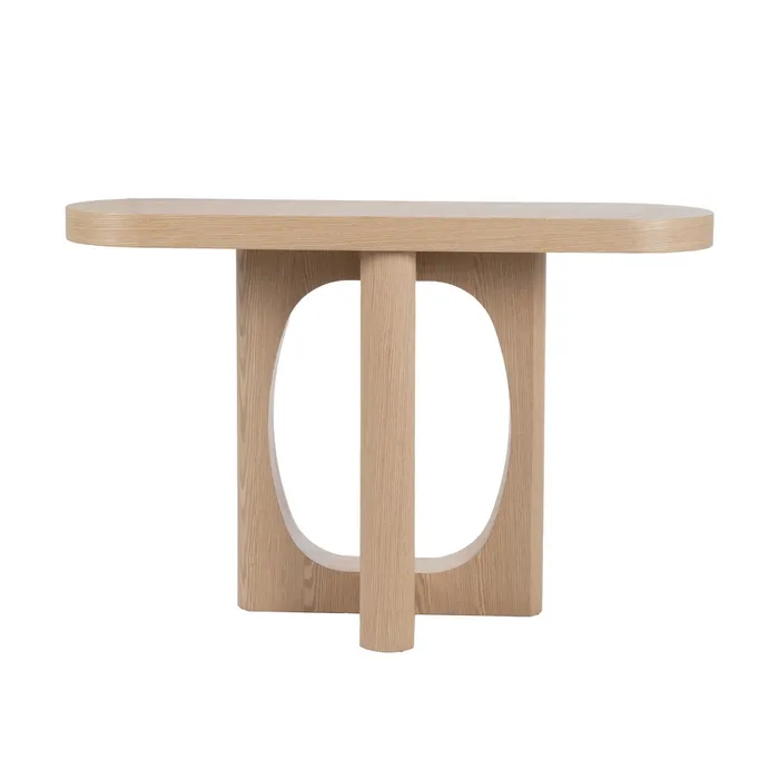 Konsola Natural Way, która wniesie do Twojego wnętrza odrobinę harmonii i minimalistycznej elegancji. Jej unikalny design, inspirowany organicznymi kształtami, sprawia, że jest czymś więcej niż tylko meblem – staje się dziełem sztuki. Mebel wyróżnia się swoją wyjątkową, monolityczną podstawą z naturalnego drewna, w której wycięto duży, owalny otwór, a przez jego środek przechodzi solidna, cylindryczna kolumna. Blat o zaokrąglonych krawędziach idealnie dopełnia całości, tworząc spójną i płynną kompozycję.