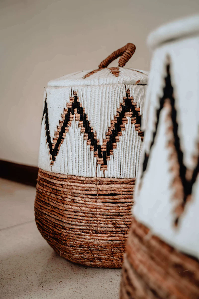 Rzemieślniczy kunszt: Każdy egzemplarz jest wyplatany ręcznie, co gwarantuje, że Twój kosz jest jedyny w swoim rodzaju. Połączenie jasnej plecionki z czarnym sznurkiem bawełnianym to hołd dla tradycyjnego rękodzieła w nowoczesnym wydaniu.