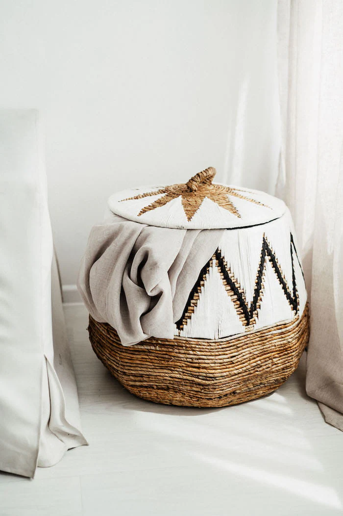 Praktyczne detale: Kosz wyposażony jest w dopasowaną pokrywę z urokliwym uchwytem z makramy. Dzięki temu zawartość pozostaje ukryta, a przenoszenie pojemnika jest niezwykle wygodne.
