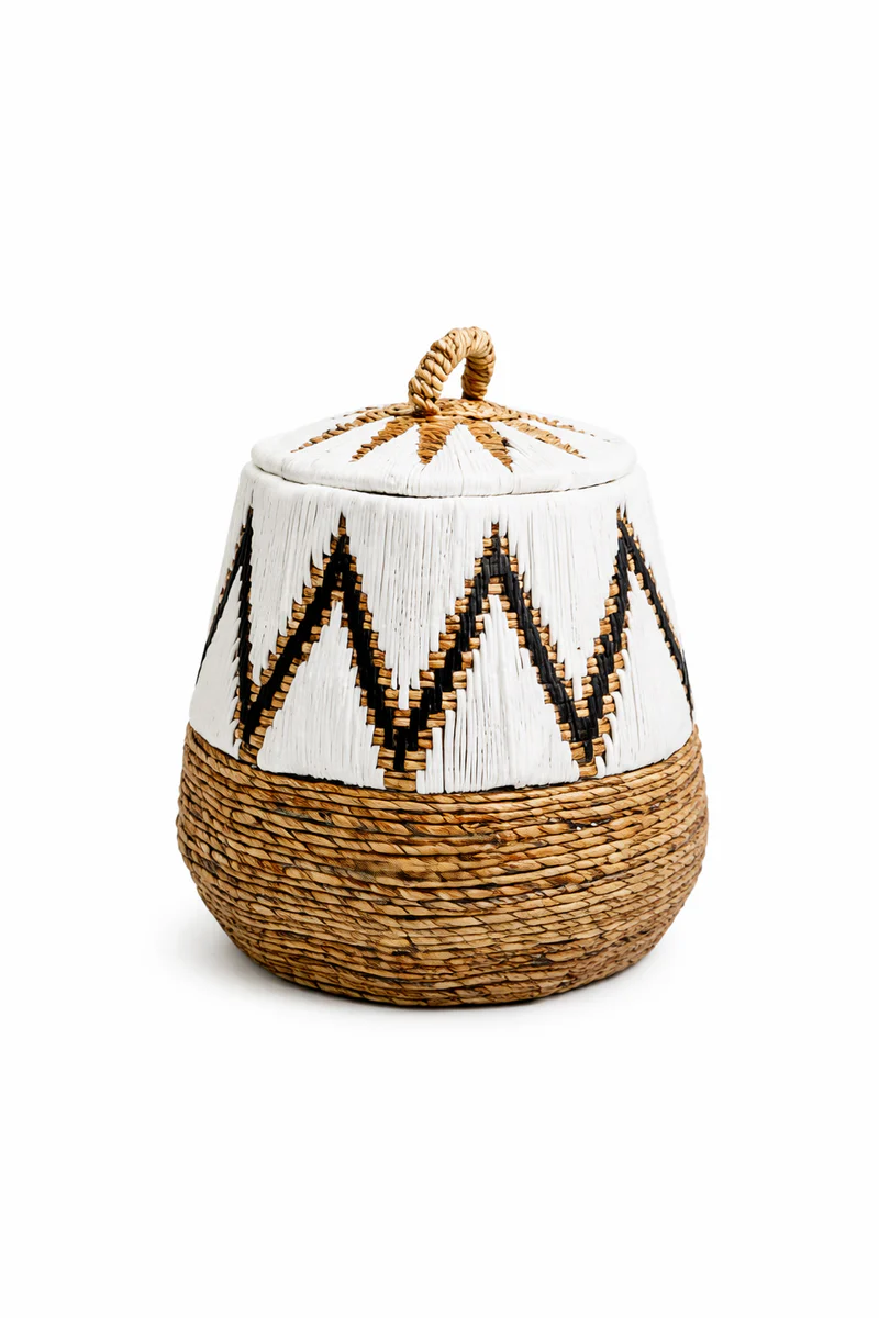 Kosz Peru w kolorze białym (rozmiar S) to kwintesencja rzemiosła i naturalnego designu. Połączenie egzotycznego liścia bananowca z misterną, czarną makramą tworzy kontrast, który przyciąga wzrok i nadaje pomieszczeniu unikalny, etniczny charakter.