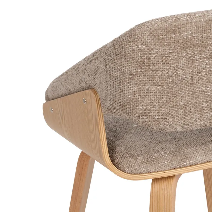 Odkryj harmonię formy i funkcji w tym krześle, które łączy nowoczesny design z naturalnym ciepłem drewna. Jego unikatowa, zakrzywiona forma zintegrowanego oparcia i podłokietników tworzy otulającą przestrzeń do siedzenia, a tapicerka z modnej tkaniny chenille o subtelnej fakturze dodaje mu wyrafinowania. Solidna, jesionowa konstrukcja o naturalnym wykończeniu zapewnia stabilność i ponadczasowy wygląd. Krzesło to jest idealnym wyborem, by wnieść do każdego wnętrza element elegancji i komfortu.