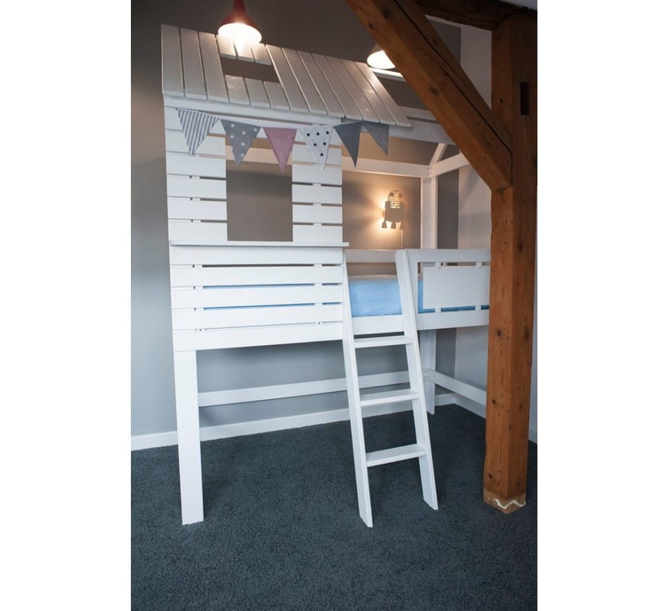 Uroczy duży domek łączy funkcje łóżka do spania i wymarzonego miejsca do zabawy.