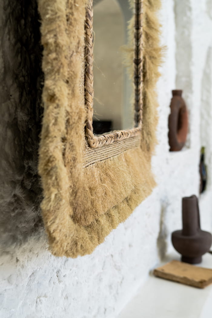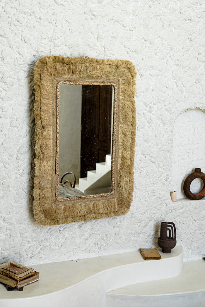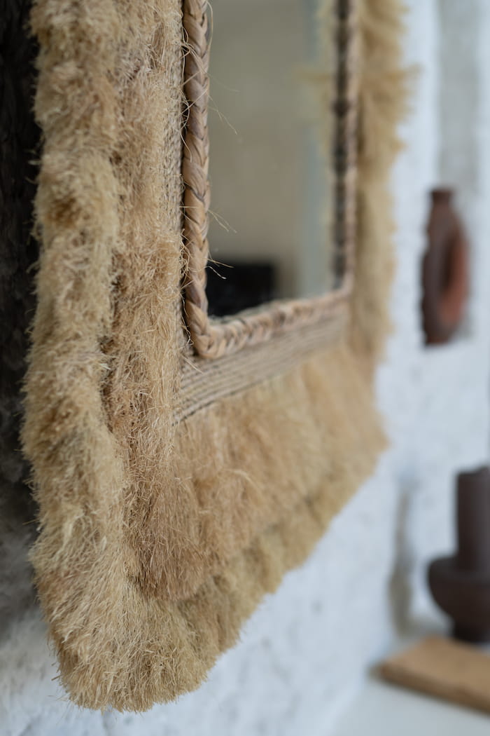 To niepowtarzalne, ręcznie robione lustro ścienne, starannie wykonane z naturalnej trawy morskiej, stanowi wyjątkowe połączenie stylu boho i nowoczesnej elegancji. Jego kwadratowy kształt, ozdobiony delikatną plecionką, emanuje prostotą i wyrafinowaniem, które przemienią twoją przestrzeń w oazę naturalnego piękna. Trawa morska dodaje całości ciepła i głębi, a szkło odbija otaczający wystrój, tworząc urzekającą grę faktur i światła.