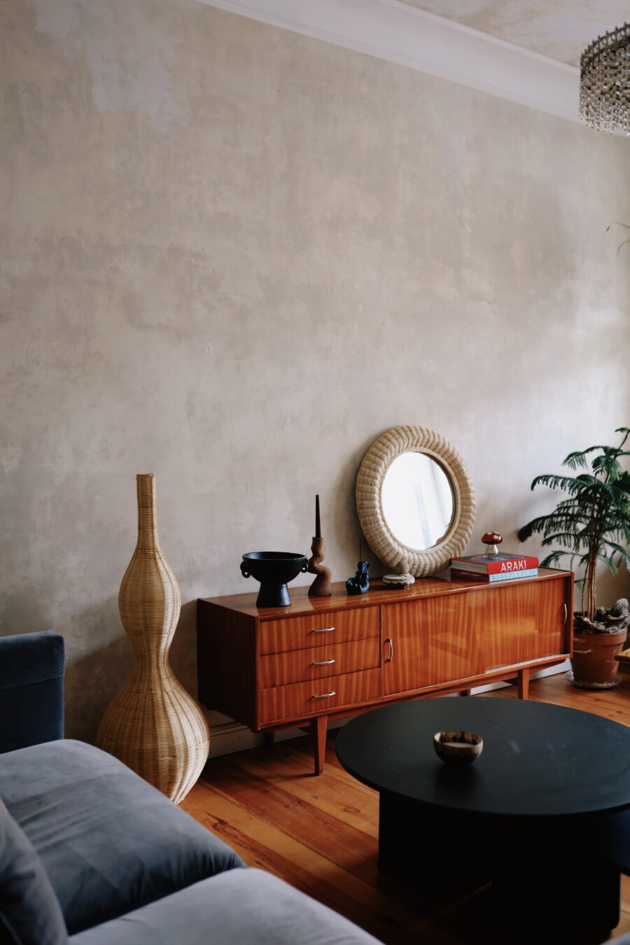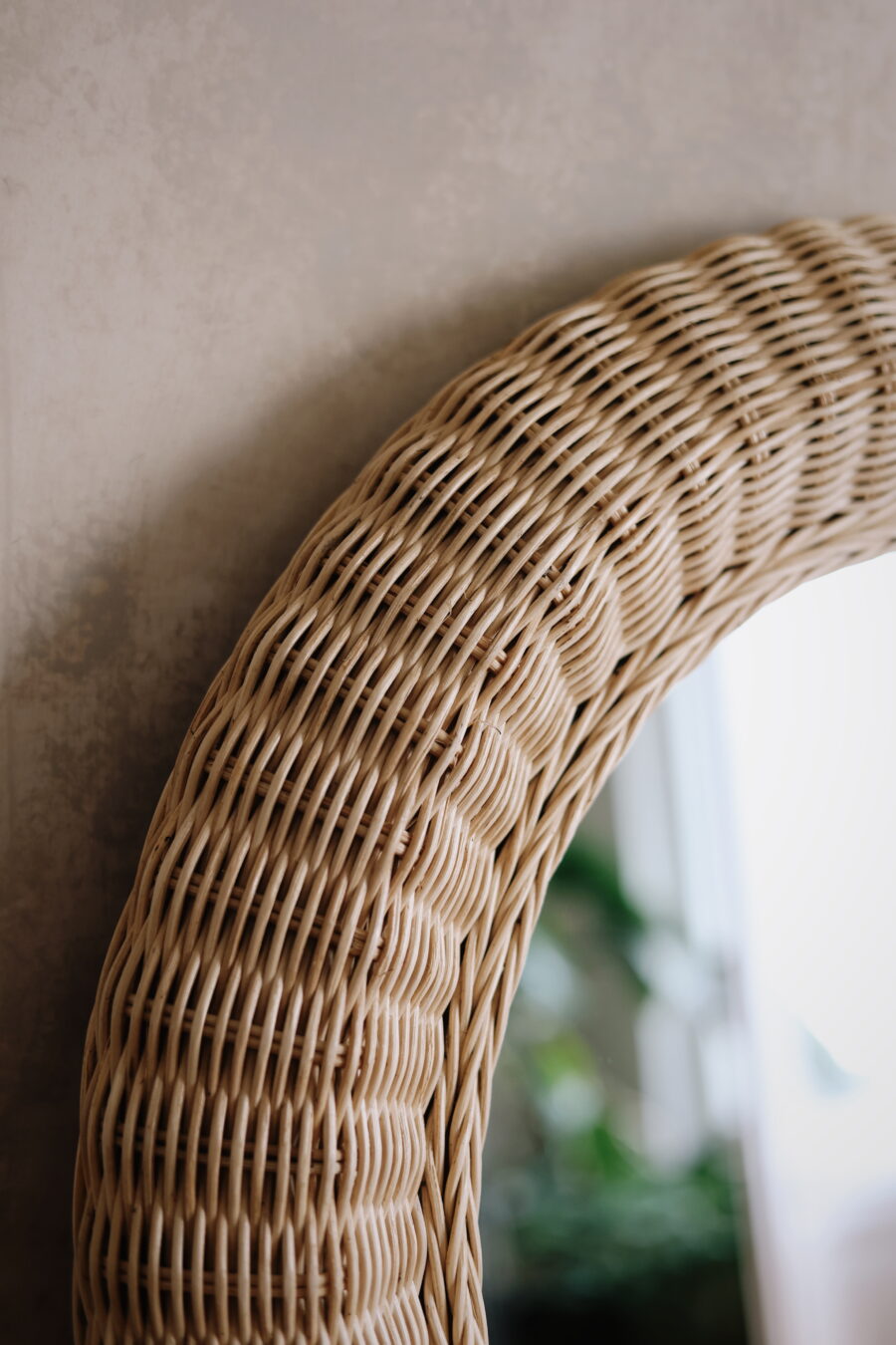 Symboliczna forma: Okrągła rama o miękkiej linii bezpośrednio nawiązuje do symboliki słońca – źródła światła i harmonii. Ręczne plecenie z naturalnego rattanu wprowadza do wnętrza spokój, równowagę i subtelne ciepło.