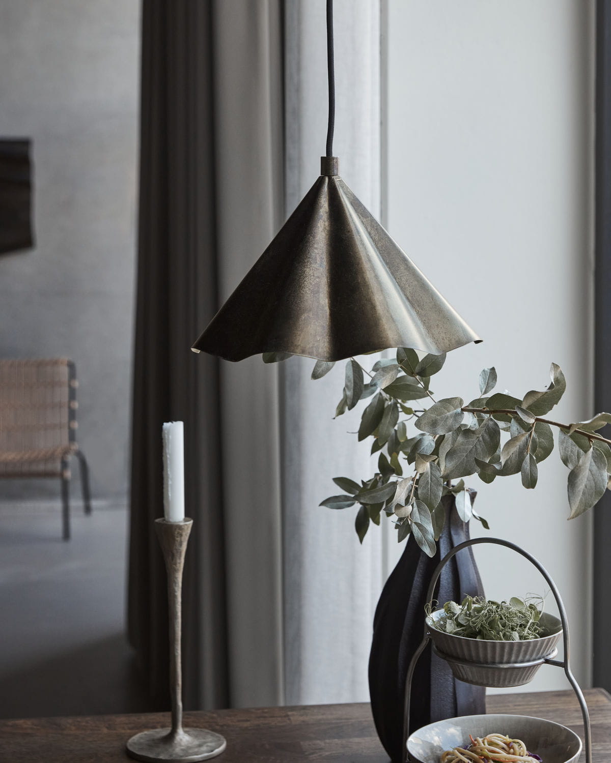 Odmień swoje wnętrze, dzięki tej małej lampie wiszącej marki House Doctor. Jej industrialne wykończenie zostało złagodzone przez falisty, opływowy kształt abażuru. Wygląd, który emanuje idealną niedoskonałością.