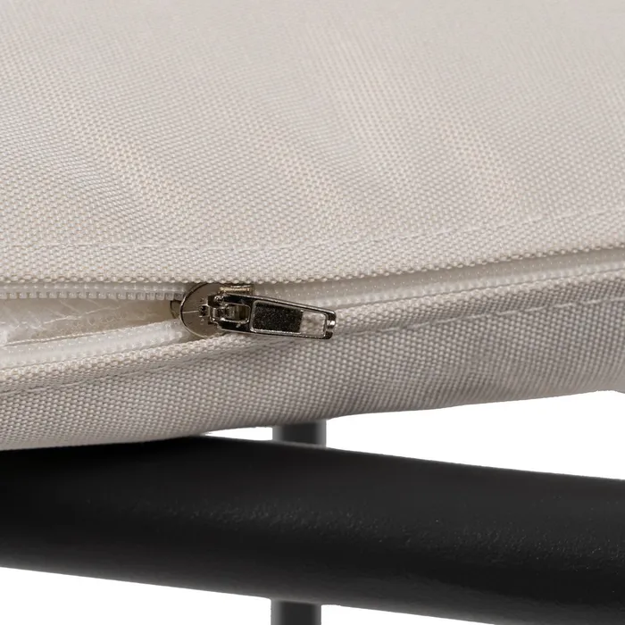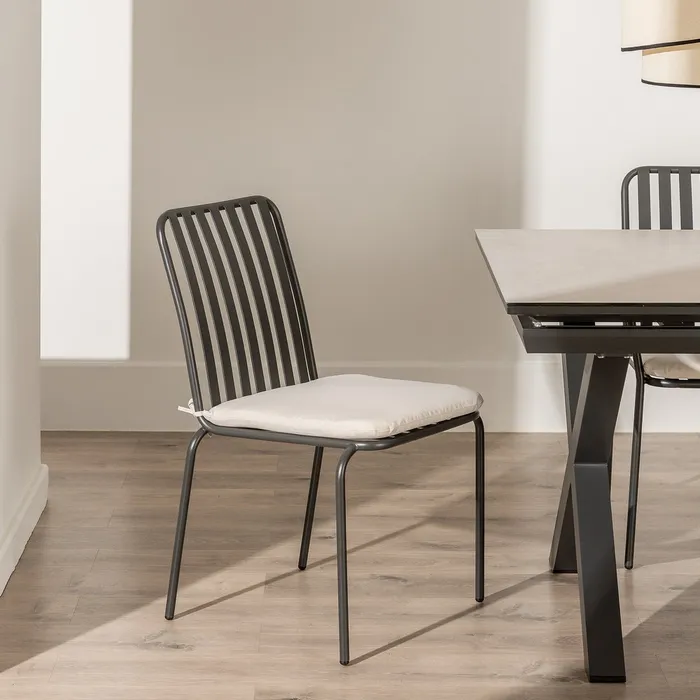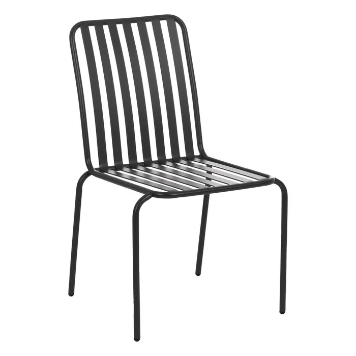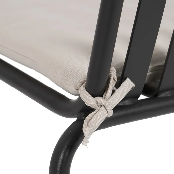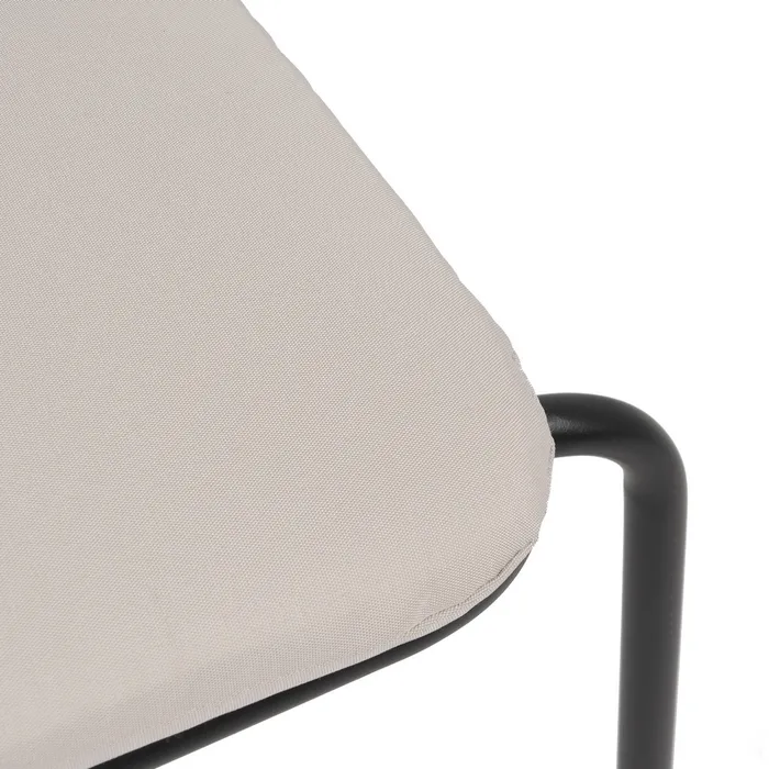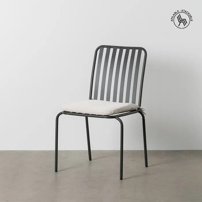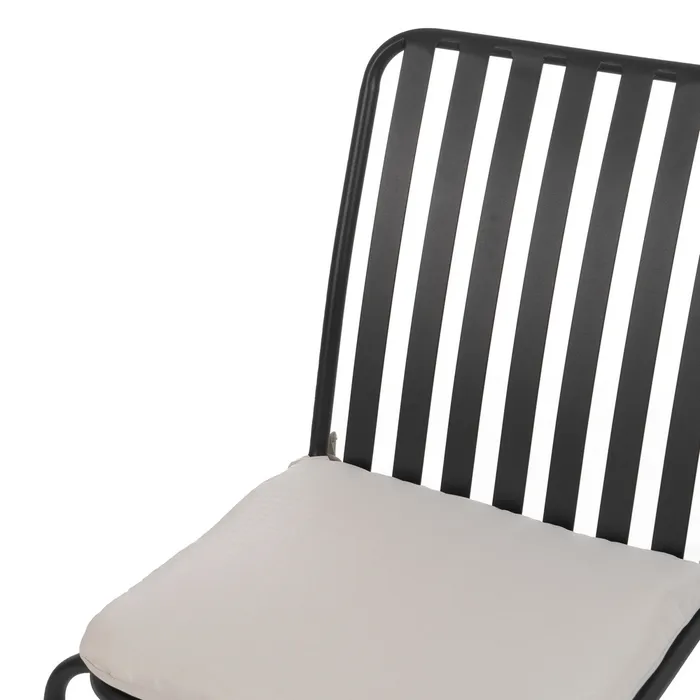 Lekkie krzesło o metalowej konstrukcji. Malowane proszkowo na kolor czarny. Wyposażone w miękką poduszkę z zamkiem błyskawicznym, dzięki czemu z łatwością utrzymasz ją w czystości. Idealne na nowoczesny taras, ale sprawdzi się również we wnętrzach w stylu minimalistycznym czy lontowym.