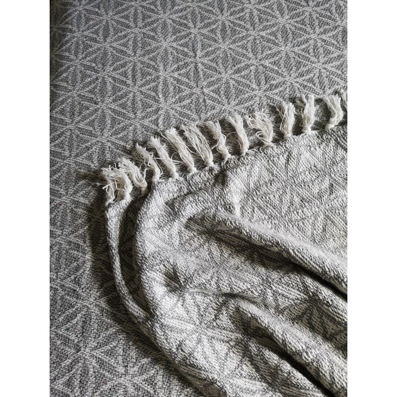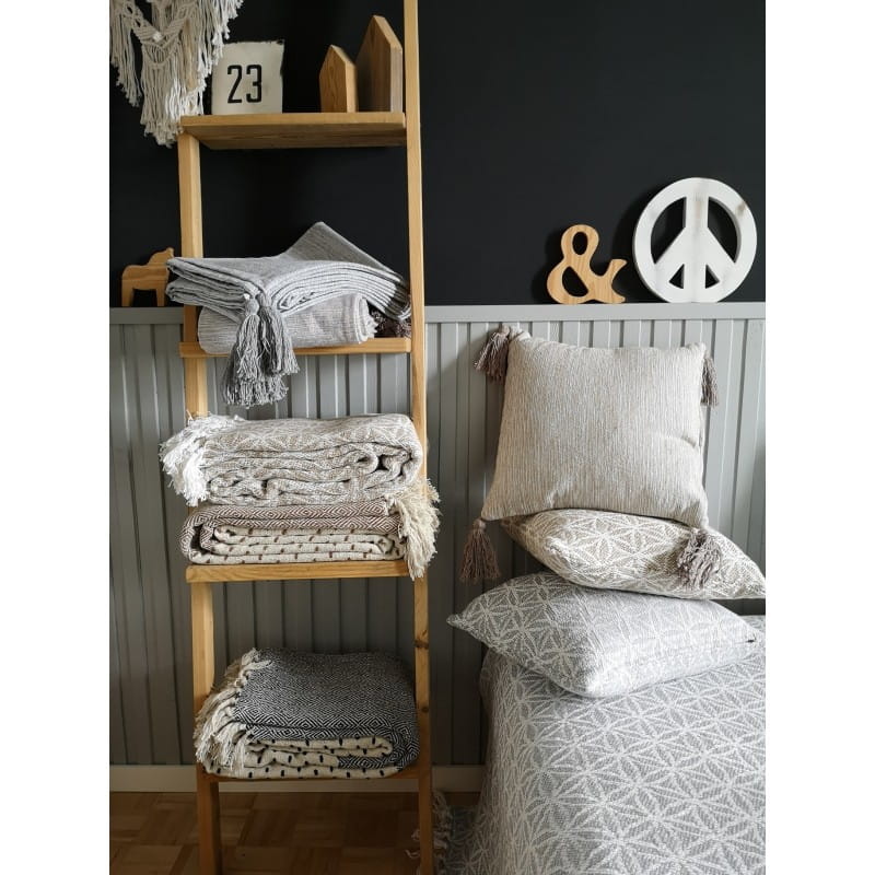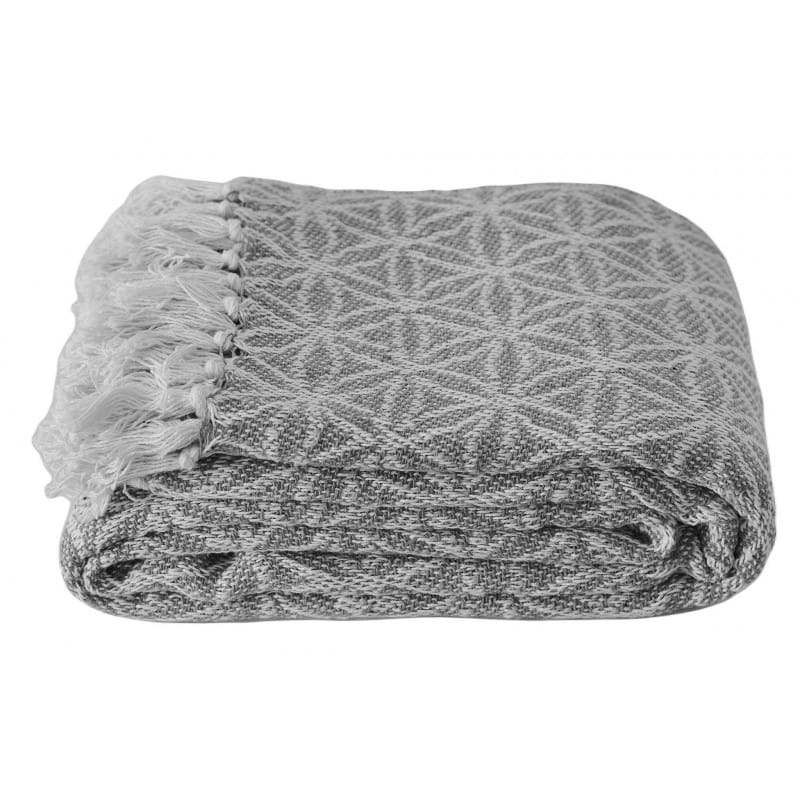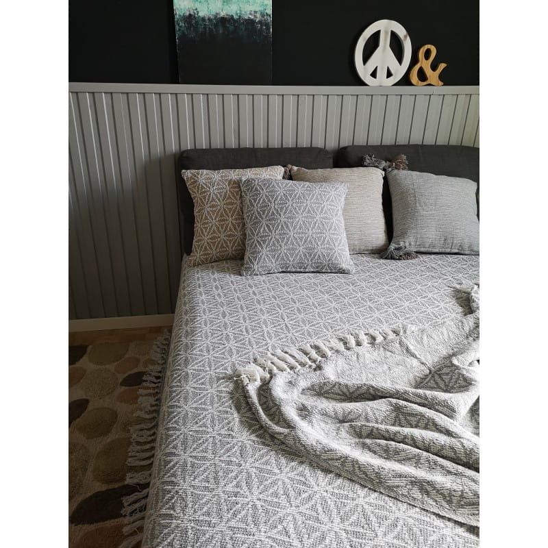 Bawełniana szaro-biała narzuta na łóżko w geometryczne wzory. Efektowne białe frędzle, znajdujące się wzdłuż krótszego boku, sprawiają, że świetnie pasuje do wszelkich aranżacji w stylu boho, czy skandynawskiego. Przyjemna w dotyku z ciekawym wzorem odświeży każdą sypialnie, czy salon. Produkt wykonany na krosnach w 100% z bawełny.