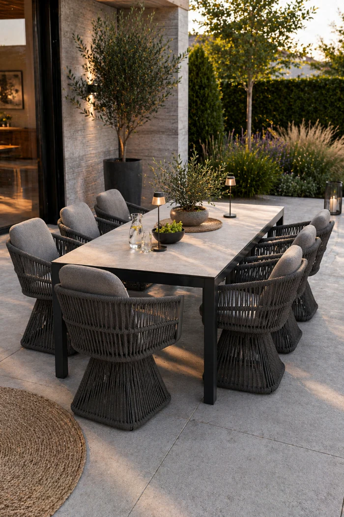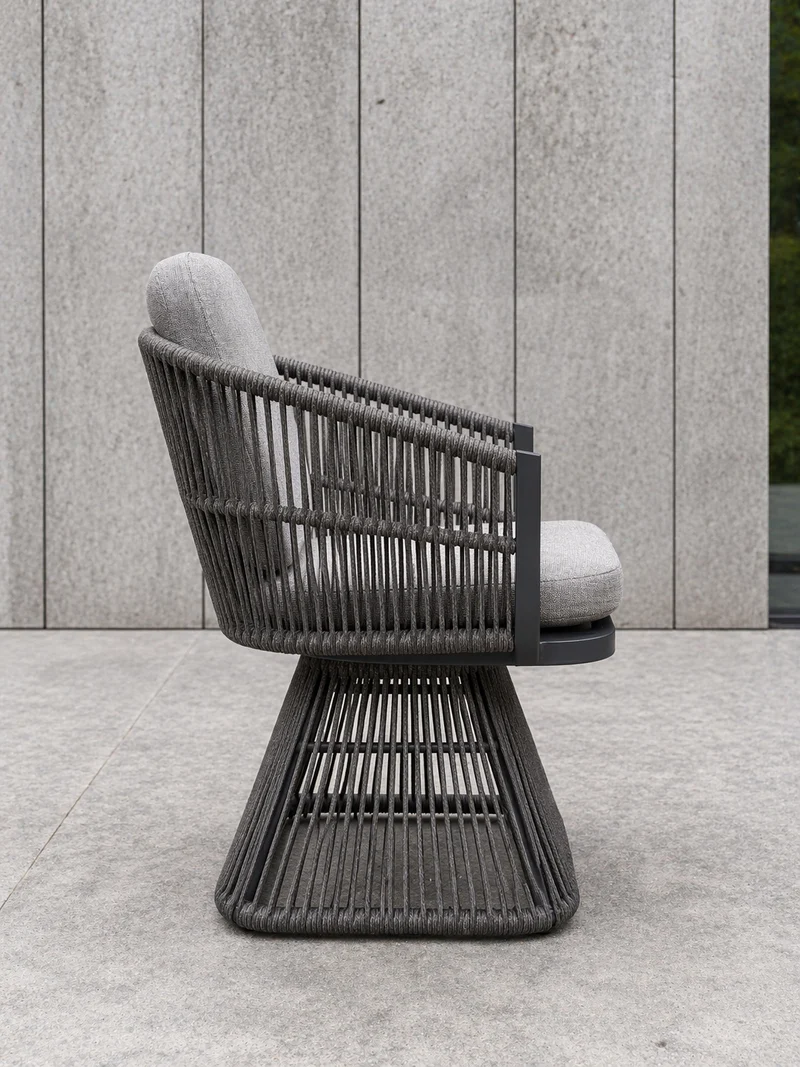 Szary sznyt: Elegancki, szary odcień zestawiony z nowoczesną fakturą liny sprawia, że fotel doskonale komponuje się z betonem, drewnem i bujną zielenią ogrodu.
