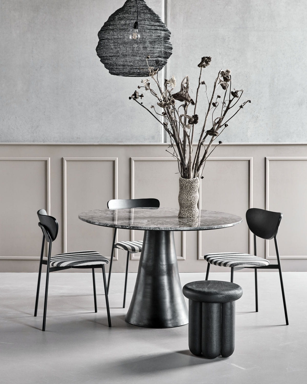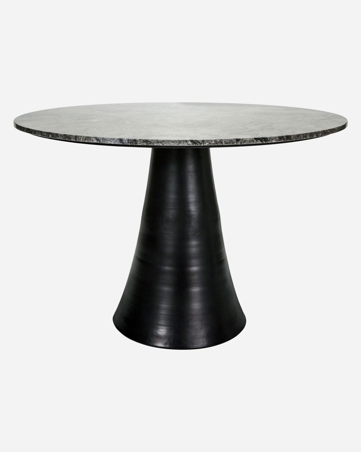 Ten ręcznie robiony stół do jadalni ma brązowy polerowany marmurowy blat i żeliwną podstawę, emanującą ekskluzywnością, estetyką i ponadczasowością. Jego okrągły kształt i podparcie kolumny sprawiają, że jest praktyczny dla maksymalnie sześciu osób.
