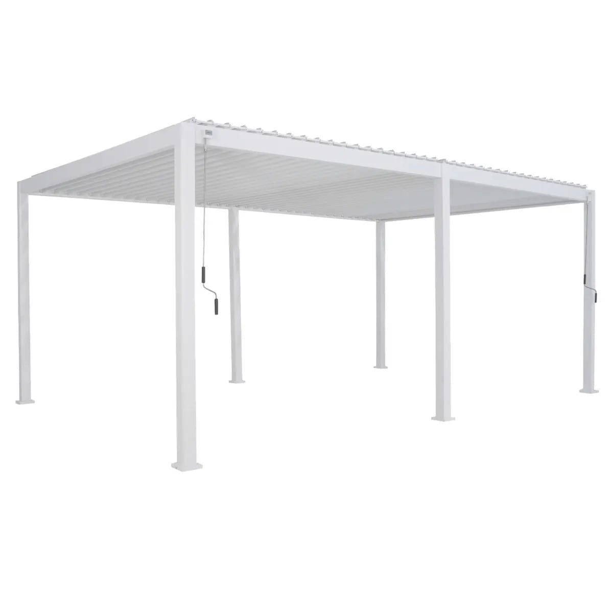 Evora Grand w kolorze białym to przestrzeń, która potrafi się zmieniać razem z Tobą i pogodą. Jej duża, dopracowana konstrukcja z aluminium pokrytego powłoką epoksydową oferuje elegancki baldachim odporny na warunki atmosferyczne. Dzięki ręcznie regulowanym, podwójnym lamelom dachowym możesz dostosować osłonę – od pełnego słońca po całkowite zacienienie, chroniąc się również przed deszczem.