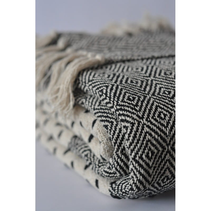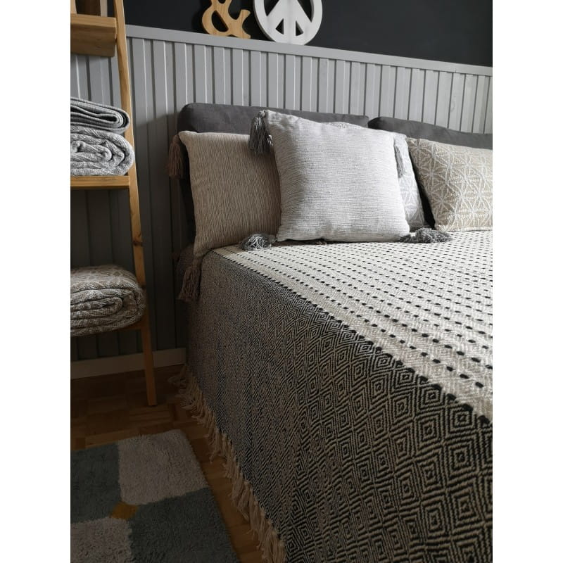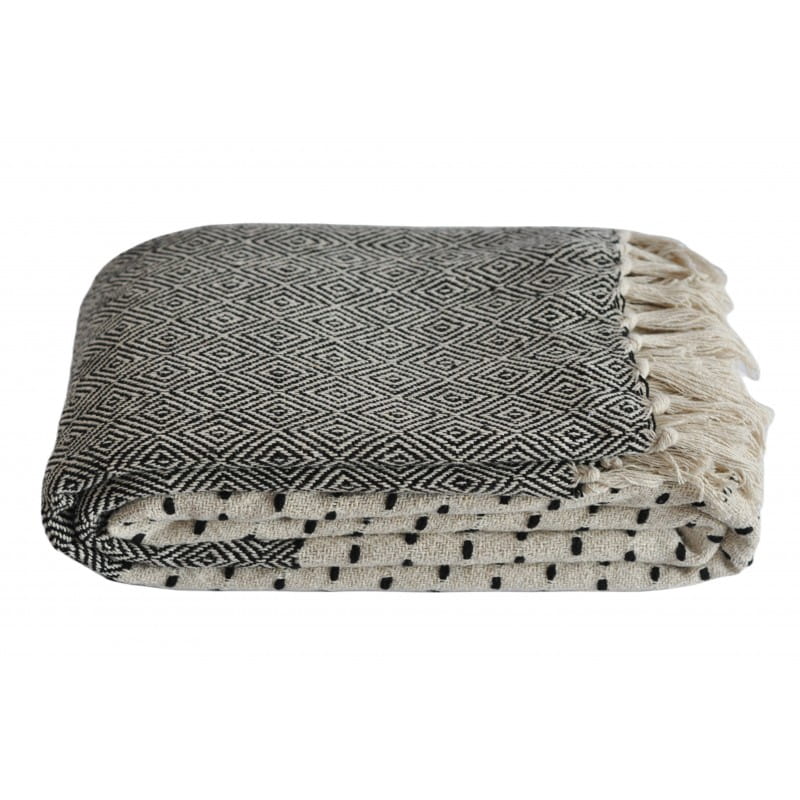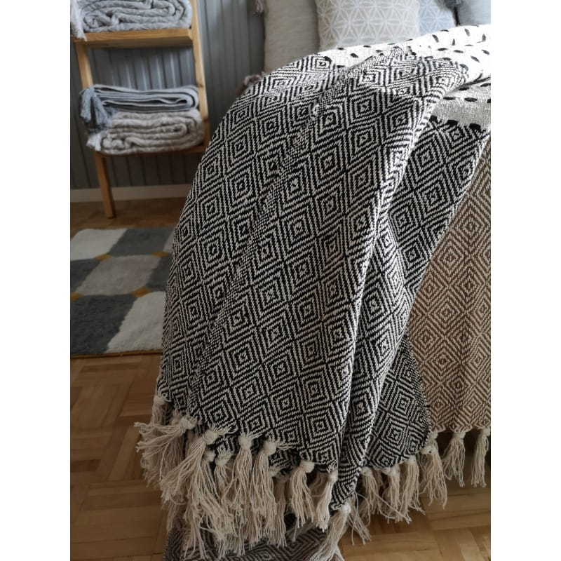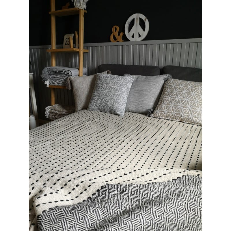Dwustronny pled na łóżko w etnicznym stylu. Przyjemny w dotyku i ciepły, wniesie przytulny klimat do każdej sypialni. Pasy w czarne diamenty o szerokości ok. 40cm rozpoczynają go i kończą. Środek wypełniają czarne kreski imitujące ozdobny ścieg. Całość dopełniają proste frędzle, o długości 6-8cm, w kolorze ecru, nadające całej narzucie charakter boho. Ręcznie wykonany w Indiach na krosnach, z przyjemnej w dotyku przędzy bawełnianej.