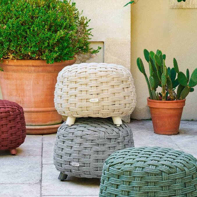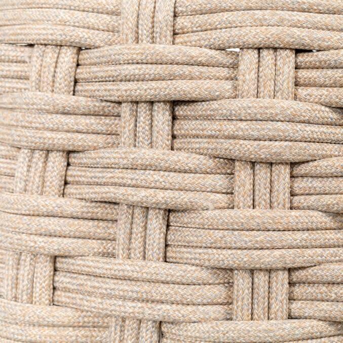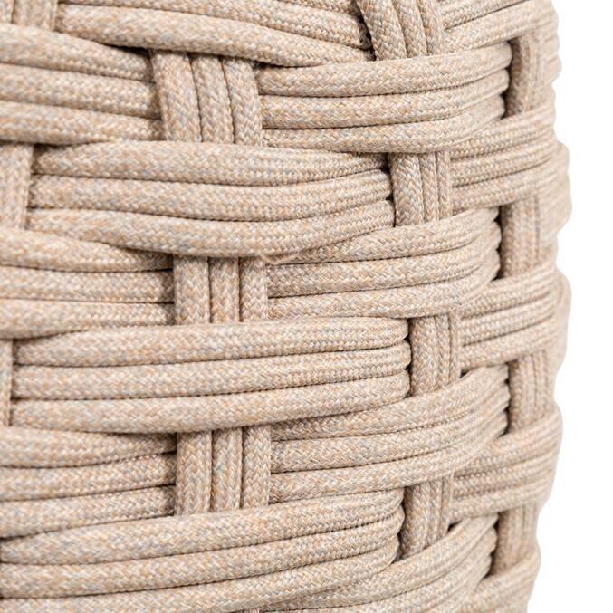 Pufa OBBAE wyróżnia się zaokrągloną, przyjazną formą. Jej sercem jest solidna aluminiowa konstrukcja, która zapewnia jej piórkową wagę i naturalną odporność na rdzę. Całość została precyzyjnie pokryta plecionką Texaline – zaawansowaną, powlekaną tkaniną, która jest jednocześnie elastyczna i odporna na wilgoć. Wypełnienie z miękkiej pianki sprawia, że pufa jest zaskakująco wygodna, a regulowane nóżki gwarantują stabilność nawet na nierównej kostce czy deskach tarasowych.