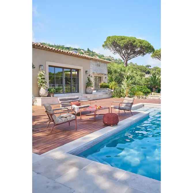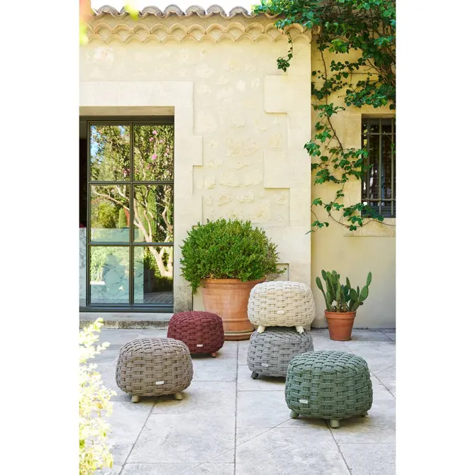 Pufa OBBAE wyróżnia się zaokrągloną, przyjazną formą. Jej sercem jest solidna aluminiowa konstrukcja, która zapewnia mu lekkość i naturalną odporność na rdzę. Całość została precyzyjnie pokryta plecionką Texaline – zaawansowaną, powlekaną tkaniną, która jest jednocześnie elastyczna i odporna na wilgoć. Wypełnienie z miękkiej pianki sprawia, że pufa jest zaskakująco wygodna, a regulowane nóżki gwarantują stabilność nawet na nierównej kostce czy deskach tarasowych.