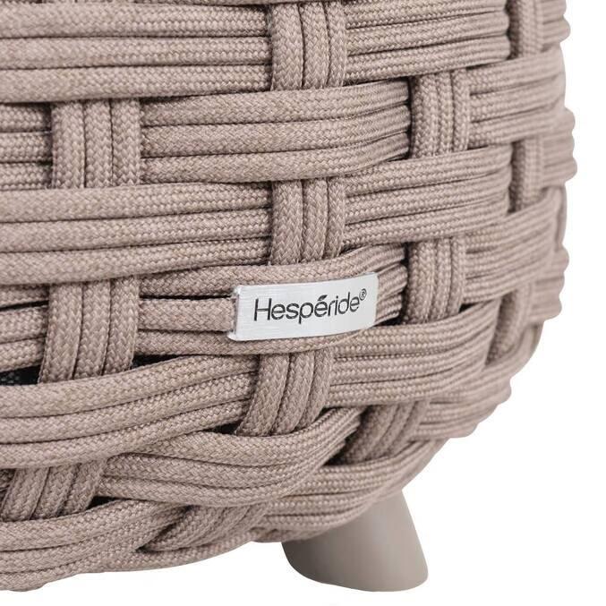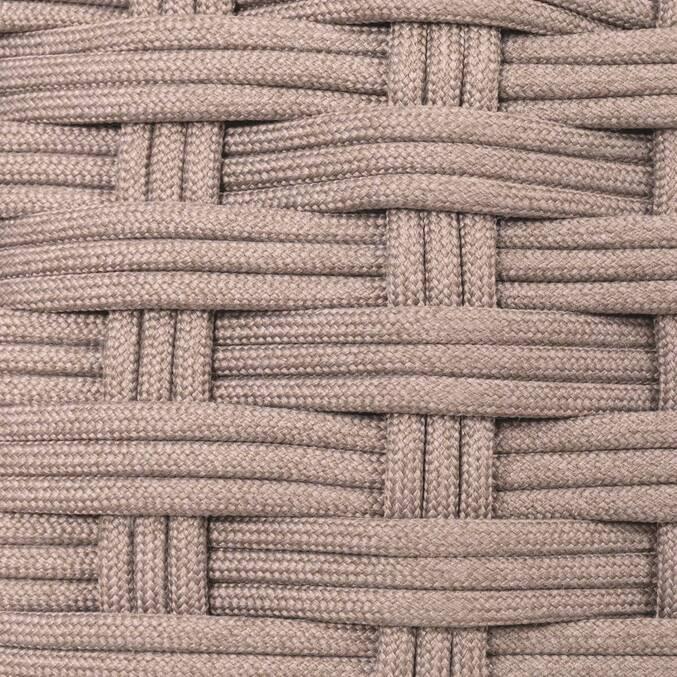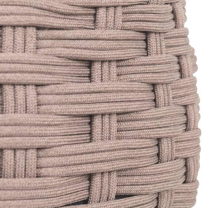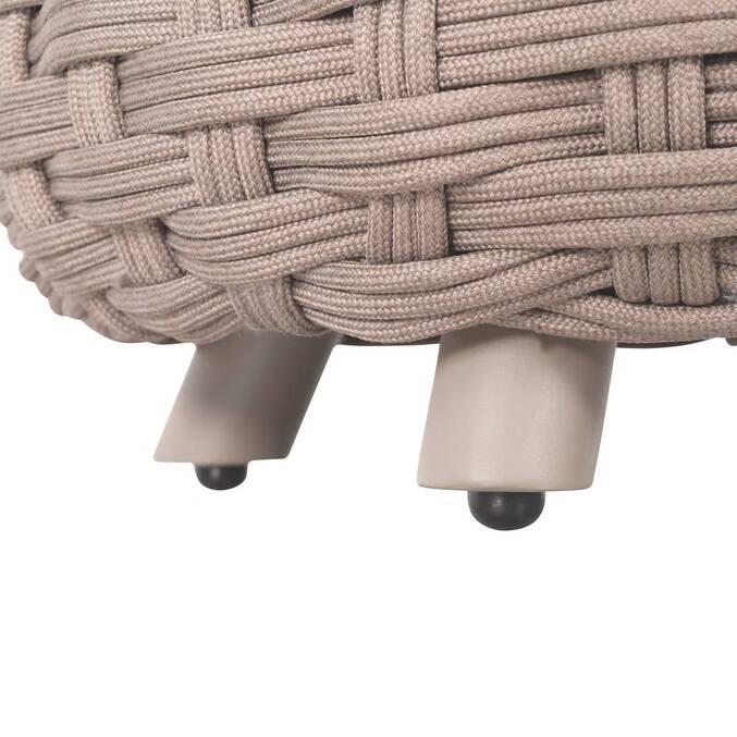 Pufa OBBAE wyróżnia się zaokrągloną, przyjazną formą. Jej sercem jest solidna aluminiowa konstrukcja, która zapewnia jej piórkową wagę i naturalną odporność na rdzę. Całość została precyzyjnie pokryta plecionką Texaline – zaawansowaną, powlekaną tkaniną, która jest jednocześnie elastyczna i odporna na wilgoć. Wypełnienie z miękkiej pianki sprawia, że pufa jest zaskakująco wygodna, a regulowane nóżki gwarantują stabilność nawet na nierównej kostce czy deskach tarasowych.