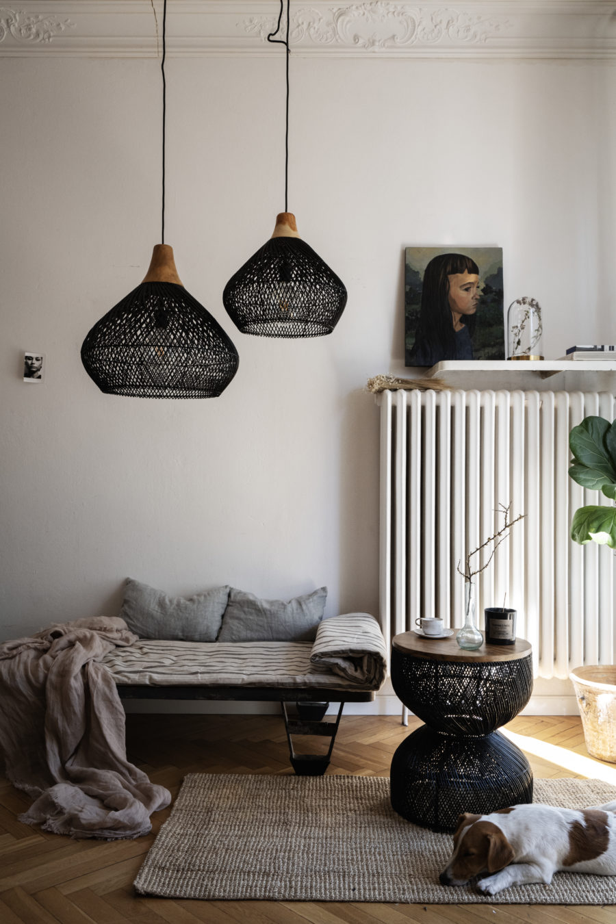 Rattanowy klosz z drewnem teakowym L - Czarny - BAND I Bally Hands