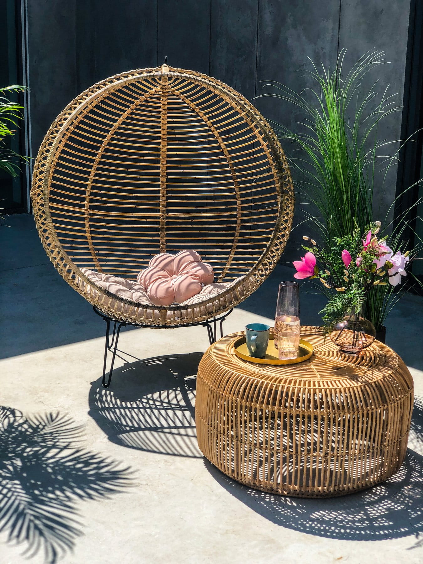 Solidny splot oraz metalowa podstawa zapewniają wysoki poziom bezpieczeństwa i komfortu. Okrągły i opływowy kształt siedziska zapewnia wspaniałe chwile relaksu, zarówno w ogrodzie, na tarasie, jak i w domowych wnętrzach.