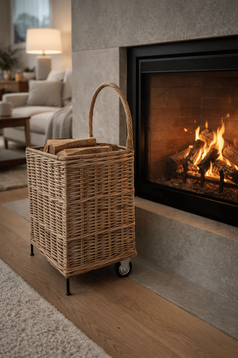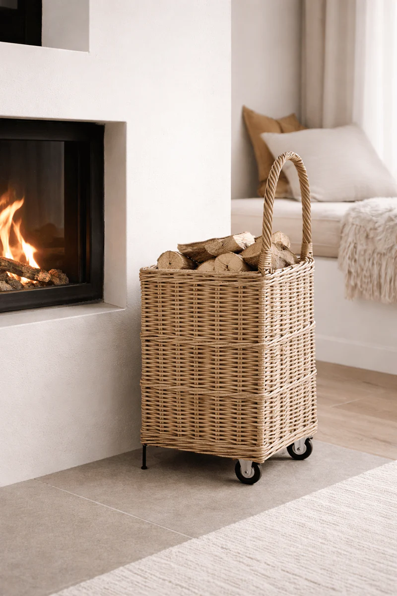 Solidna konstrukcja: Połączenie elastycznego rattanu z metalową podstawą i nóżkami gwarantuje stabilność. Wózek nie tylko przewozi drewno, ale stanowi bezpieczny punkt przechowywania, chroniąc Twoją podłogę przed korą i pyłem.
